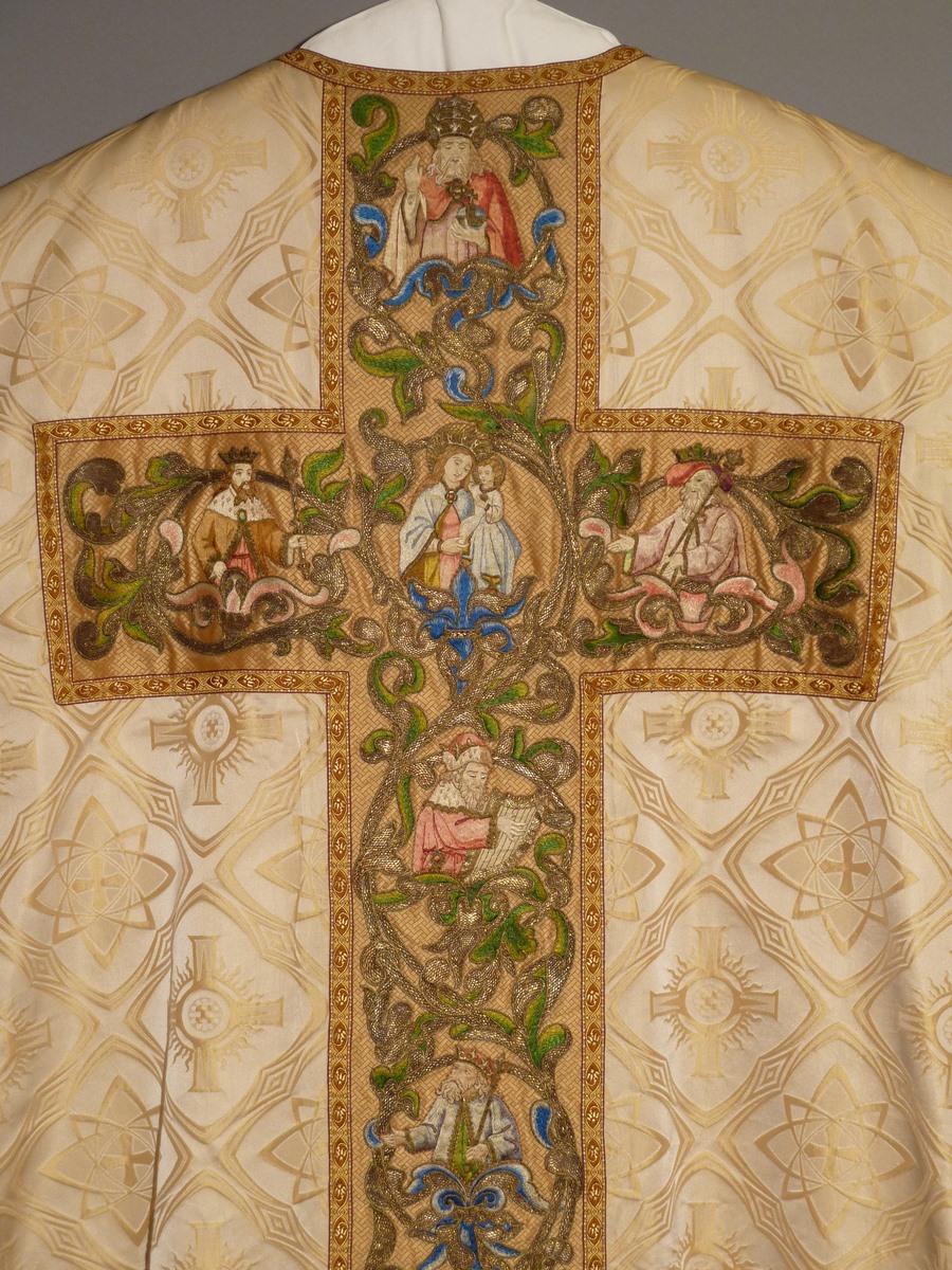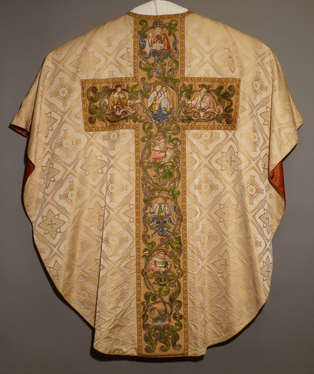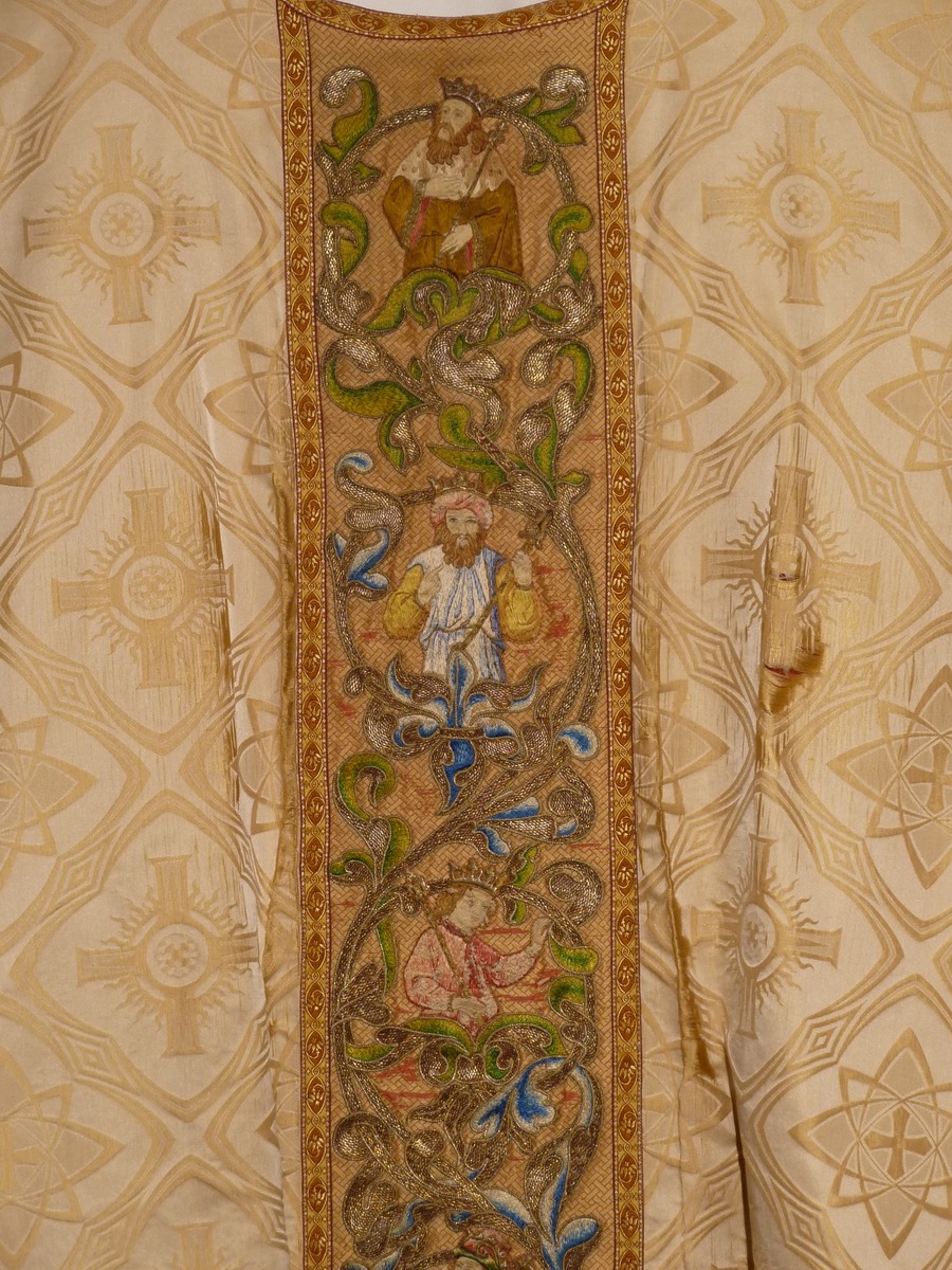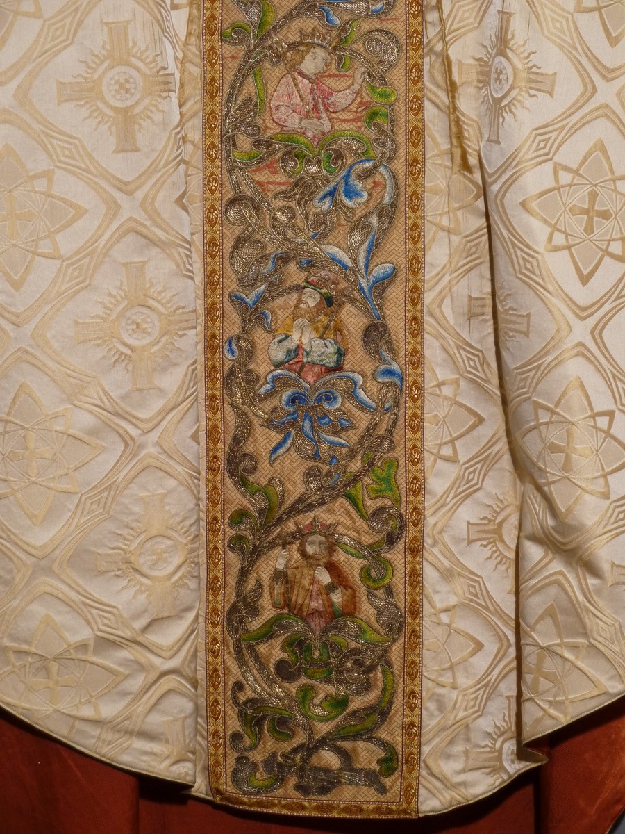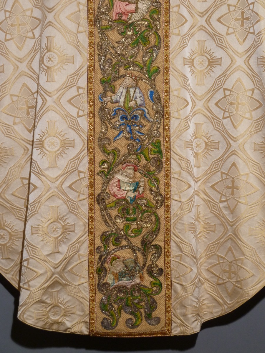 Wit kazuifel met ingeweven neogotische vierpasmotieven met geborduurde boom van Jesse