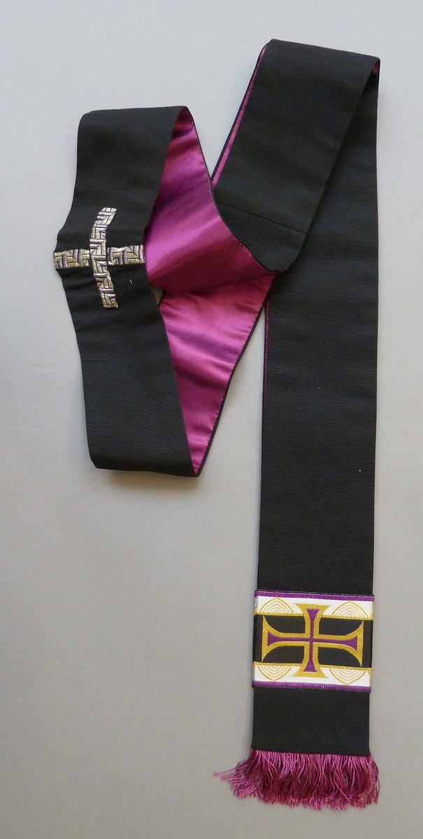 Zwarte stola met paarse voering afgezet met veelkleurig zijdeband en paars zijde franje