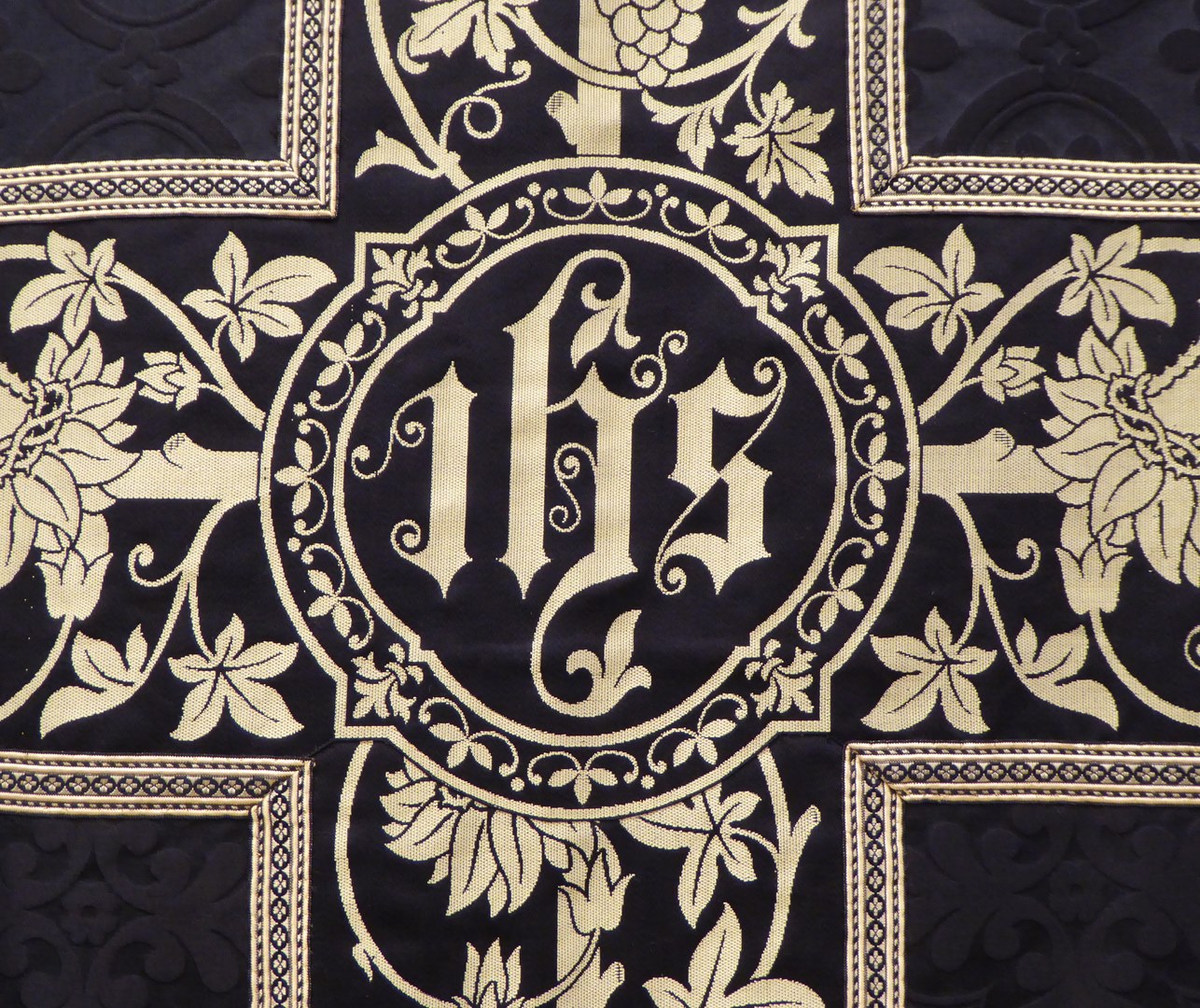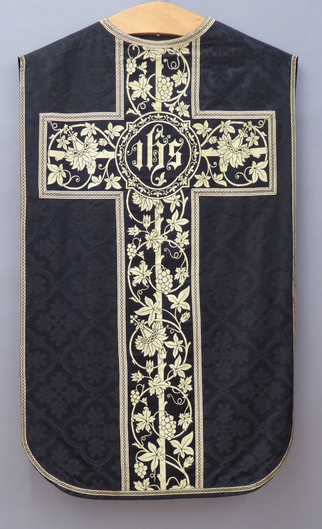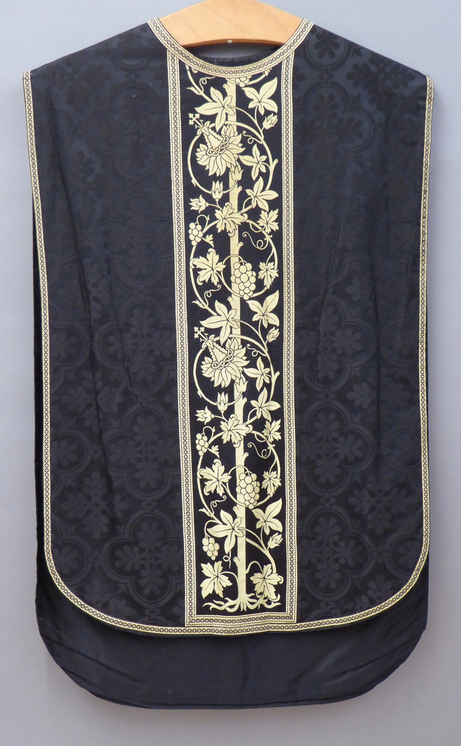 Zwart kazuifel met ingeweven vierpasmotieven, kruis en balk zwart met gele ingeweven druivenrank