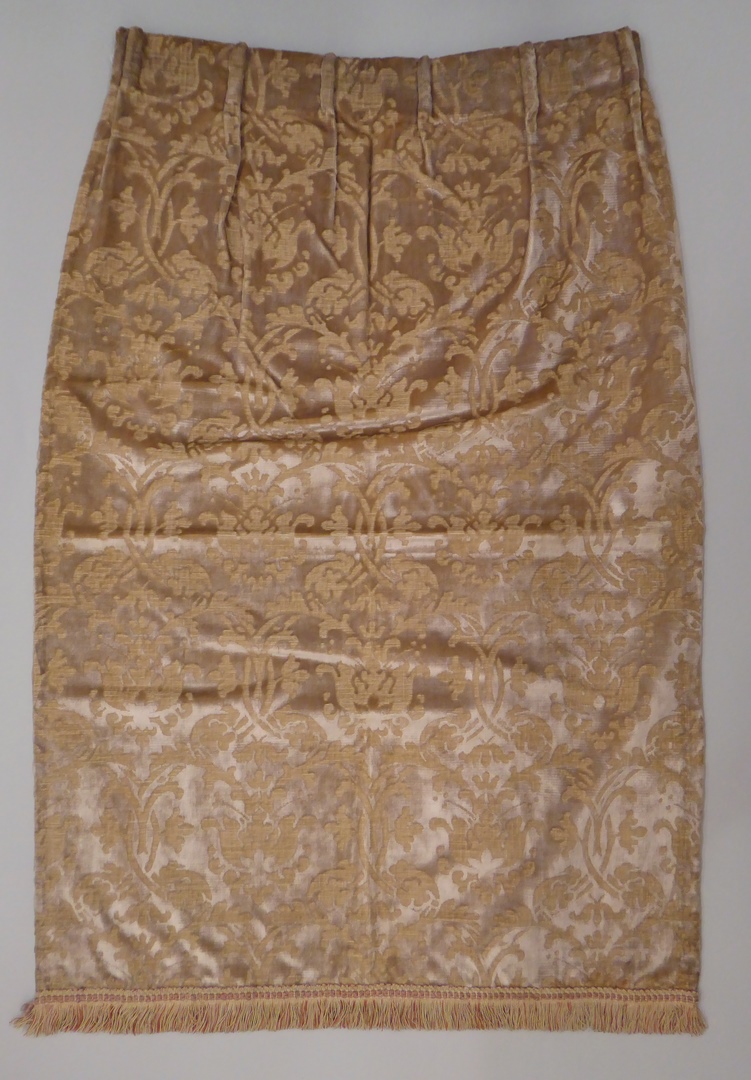 Beige fluwelen gordijn met granaatappelmotief afgezet met roze-beige franje