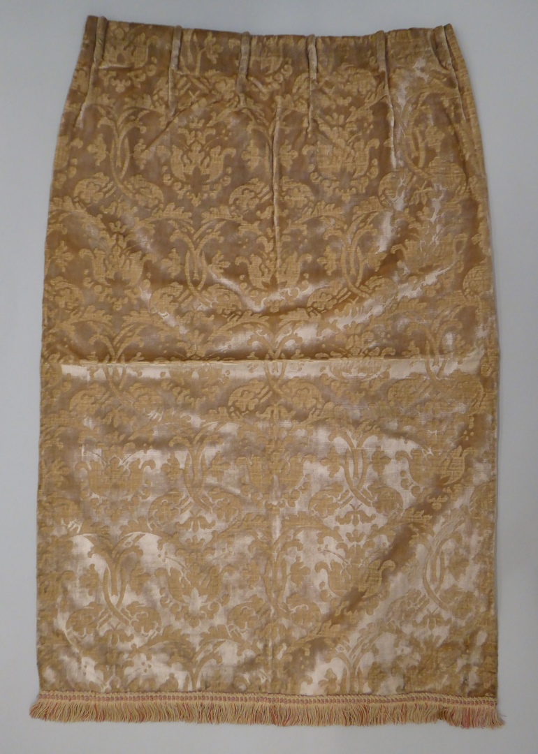 Beige fluwelen gordijn met granaatappelmotief afgezet met roze-beige franje