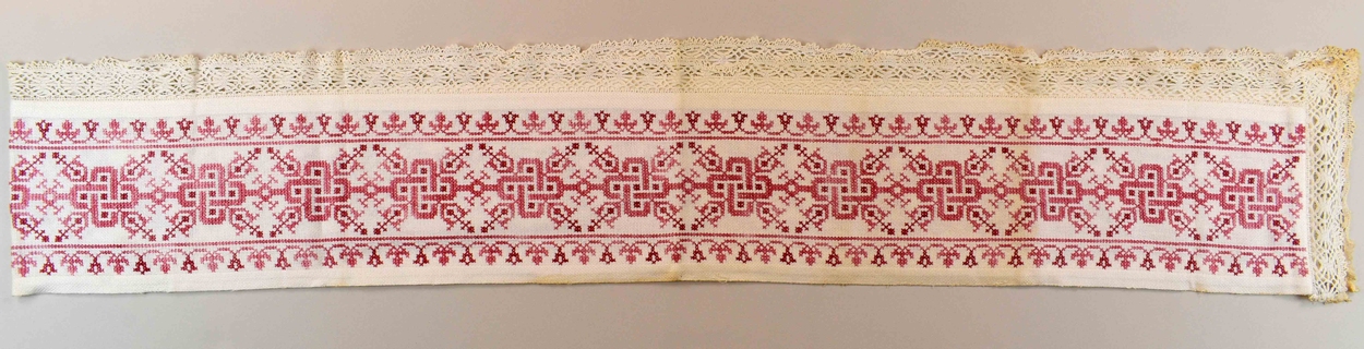Witte rand(?) van een communiebankdwaal met roze borduurwerk, afgezet met kloskant