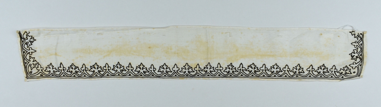 Halsdoekje voor een stola van wit katoen afgezet met machinaal borduurwerk van bladmotieven