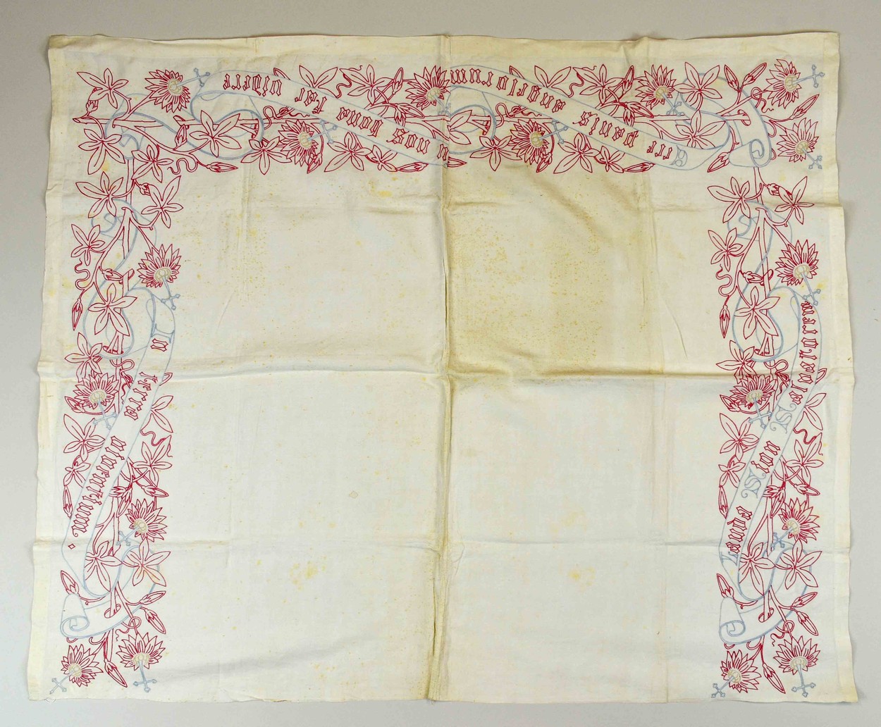 Wit kleed (verkort altaarkleed ?) met machinaal borduurwerk met neogotische bladmotieven en tekst