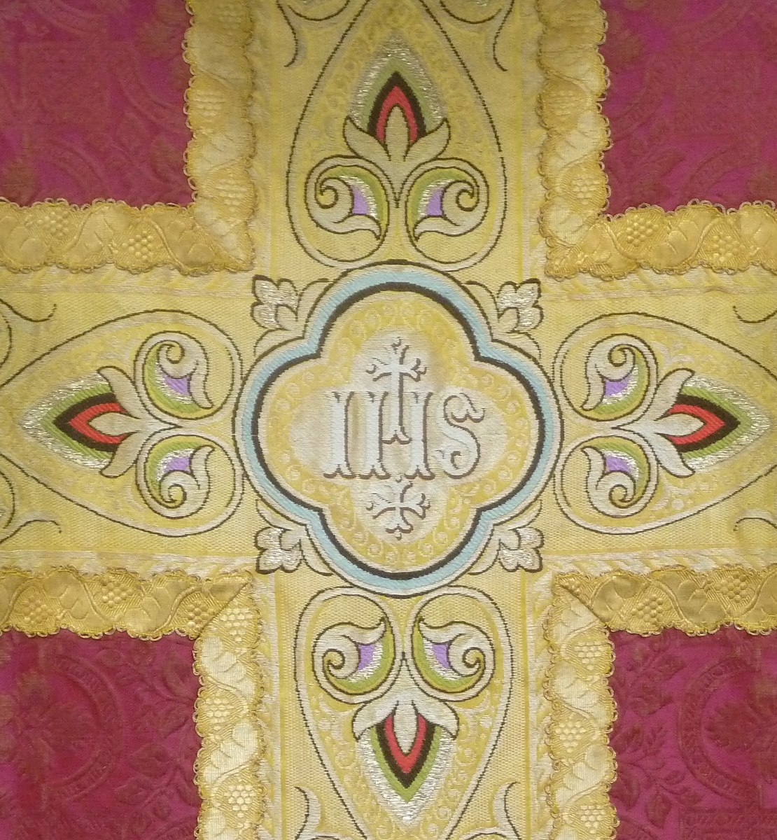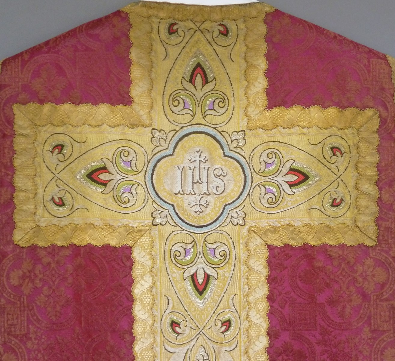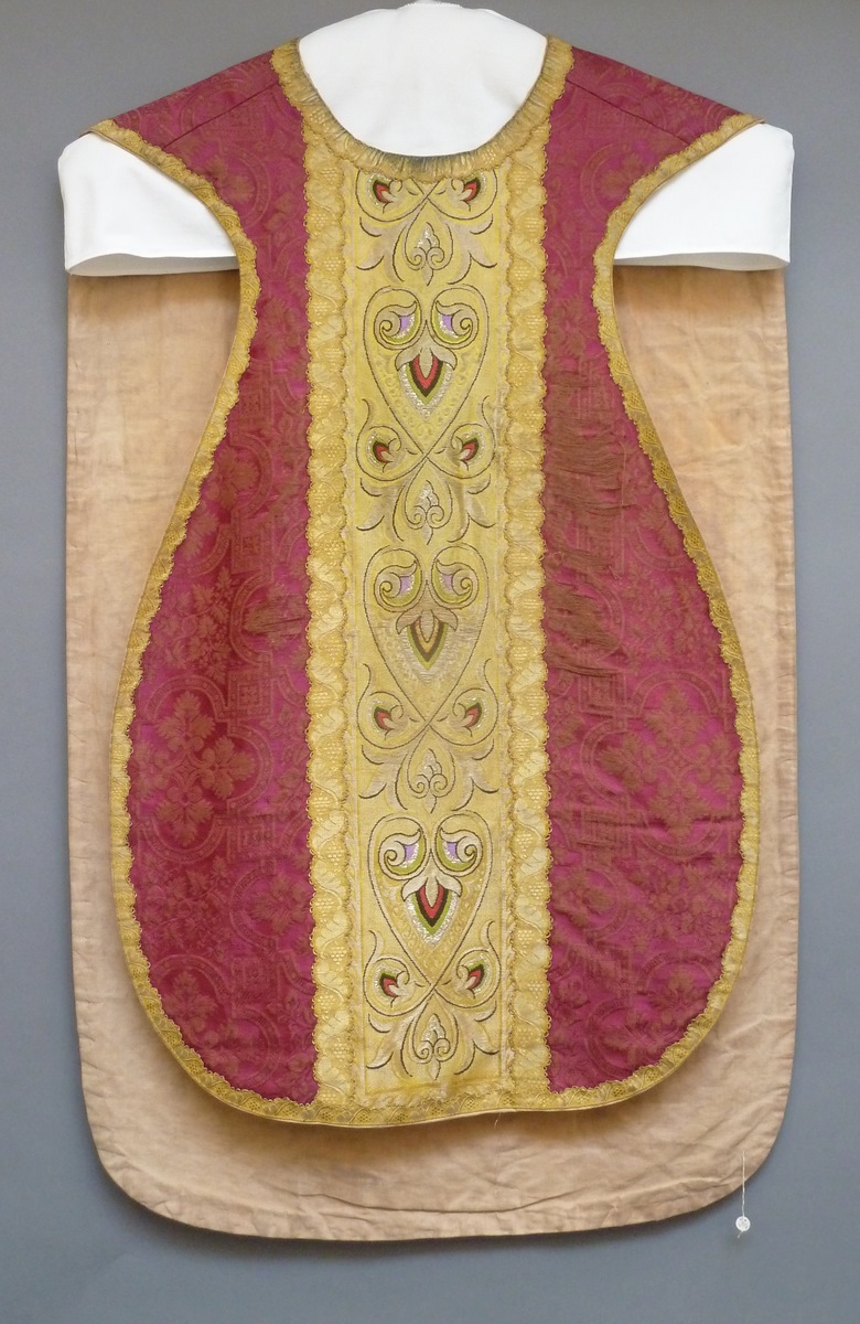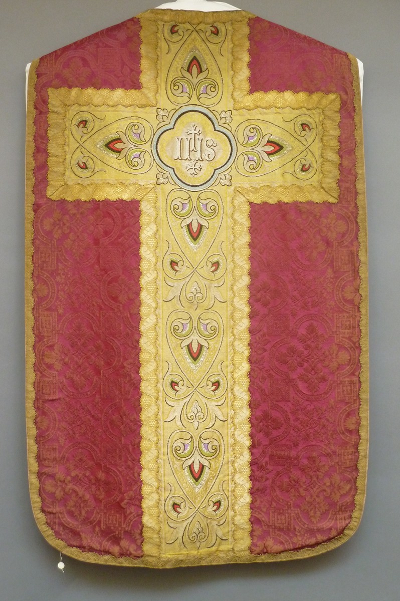 Rood kazuifel met ingeweven vierpasmotieven, kruis en kolom geel met ingeweven jugendstilmotief