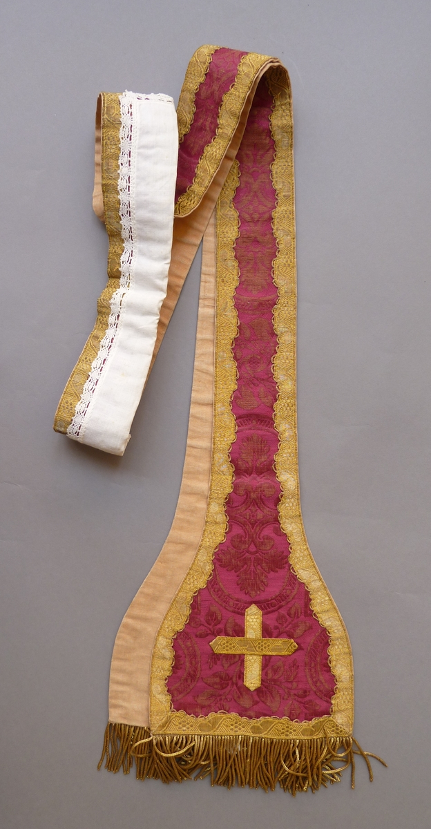 Rode stola met ingeweven vierpasmotieven afgezet met goudfranje