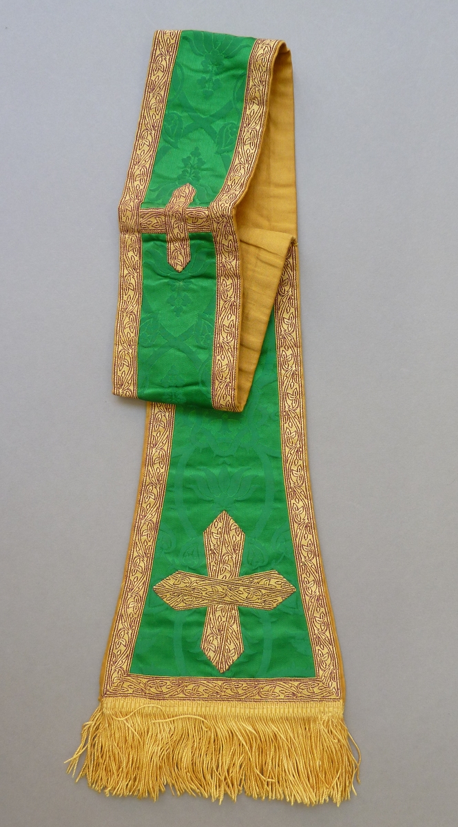 Groene manipel met ingeweven vierpasmotieven, en gele franje