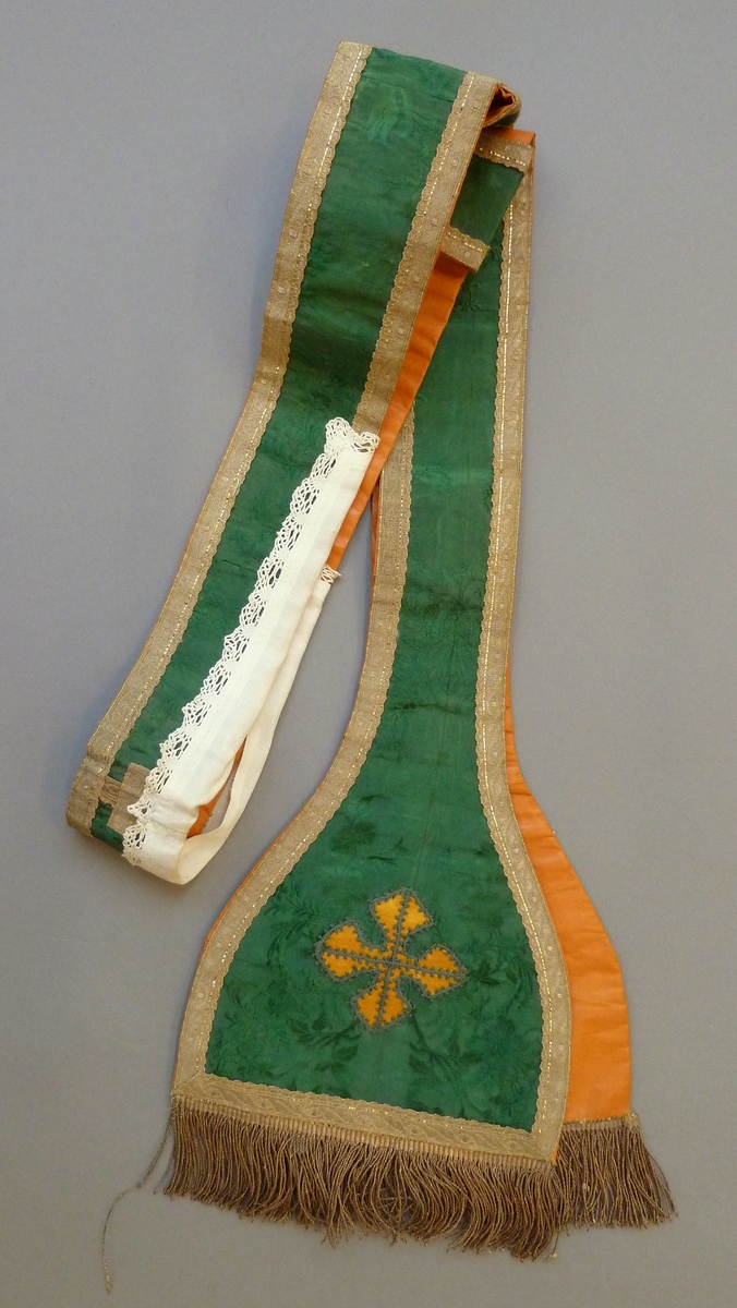 Groene diakenstola met ingeweven rankenmotieven afgezet met goudbrokaatband en gouddraad franje