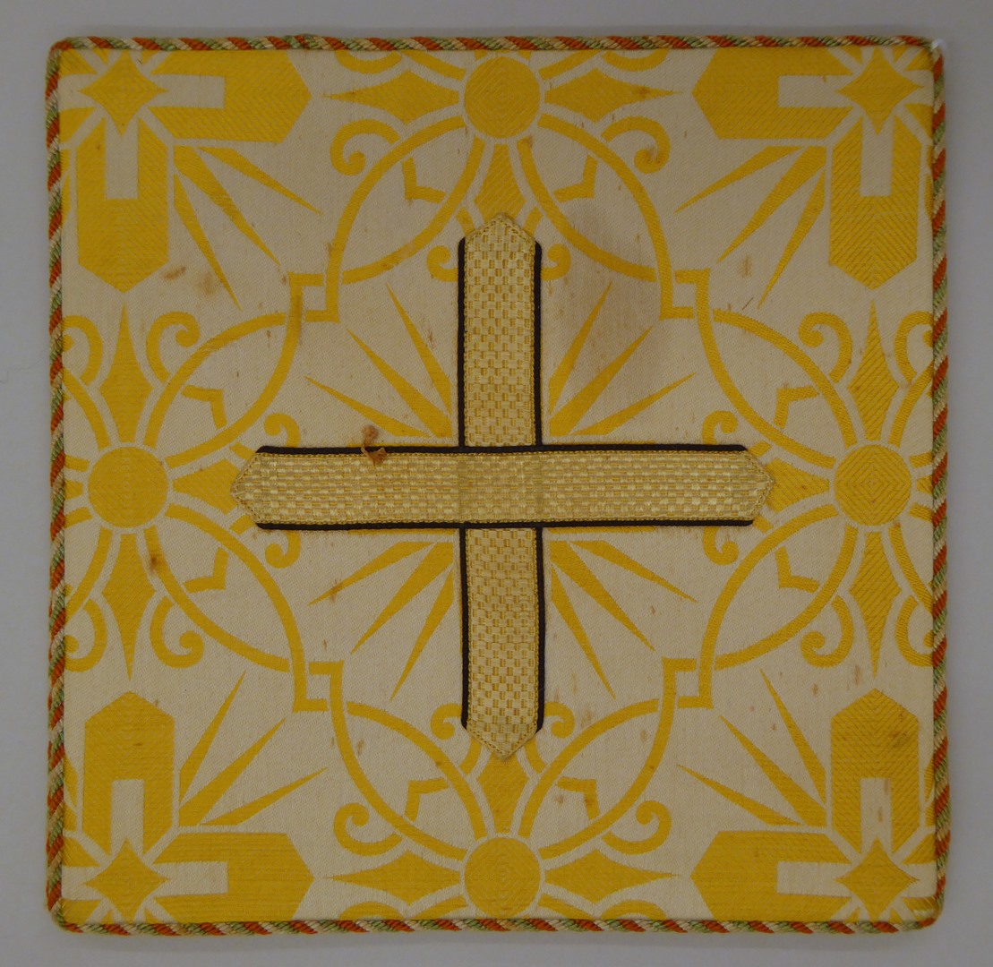 Witte beurs met ingeweven gele kruisen in vierpassen, kruisje van galonband