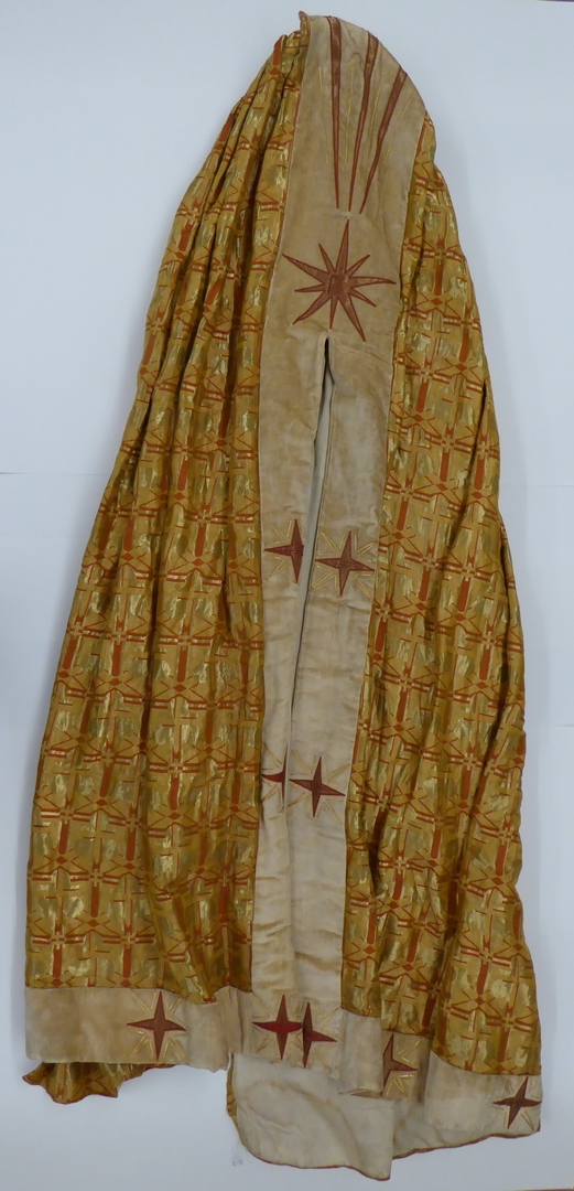 Goudbrokaat gordijn voor expositietroon met geel en rood doorweven in kruismotief