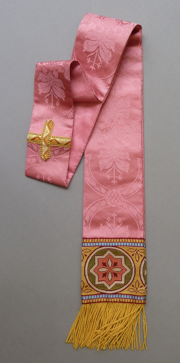 Roze manipel met veelkleurige ingeweven vierpas- en kruismotieven