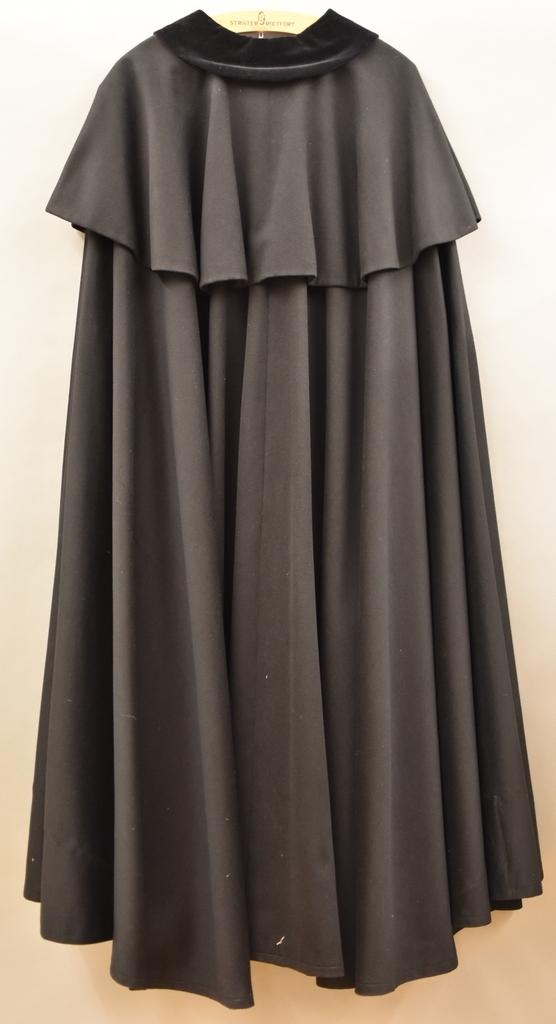 Zwarte mantel (alma viva) met pelerine, zwarte kraag en zilveren sluiting, van Alphonse Ariëns
