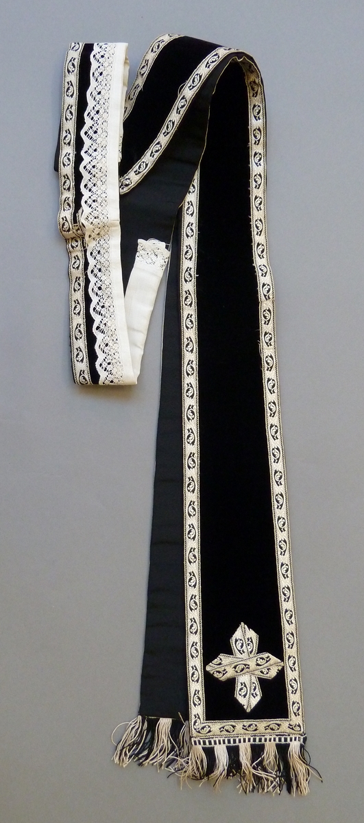Blauwe rouwstola met machinaal geborduurde bloemranken