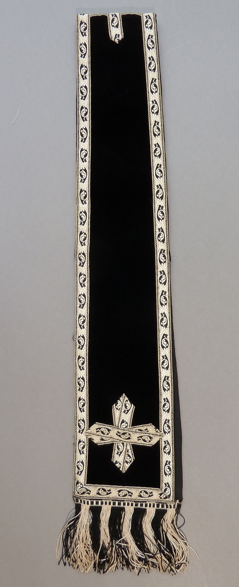 Blauwe rouwmanipel met kruisje van zwart-wit galon, zwart-witte franje