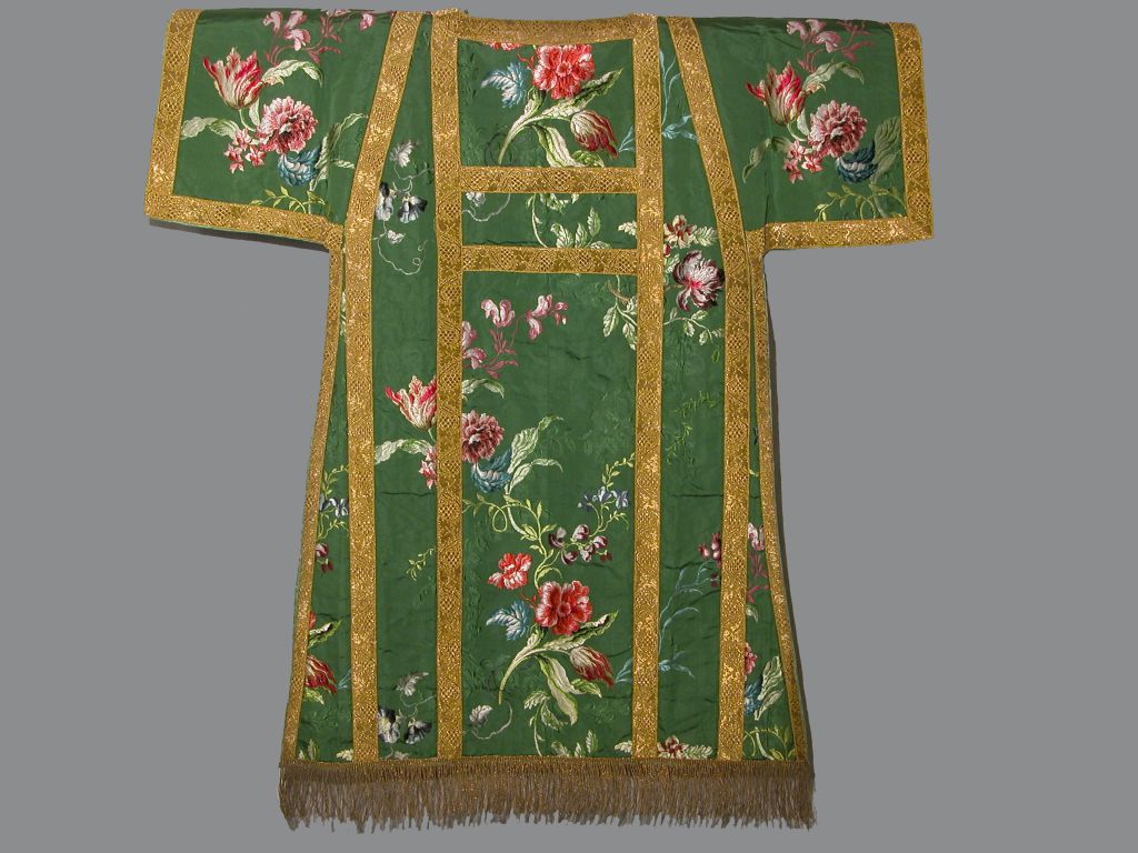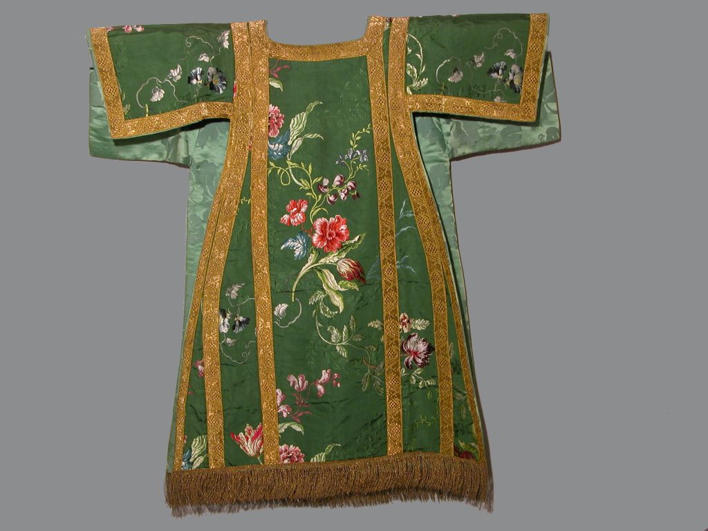 Groene dalmatiek met veelkleurig ingeweven bloemmotief, versierd met goudgalon