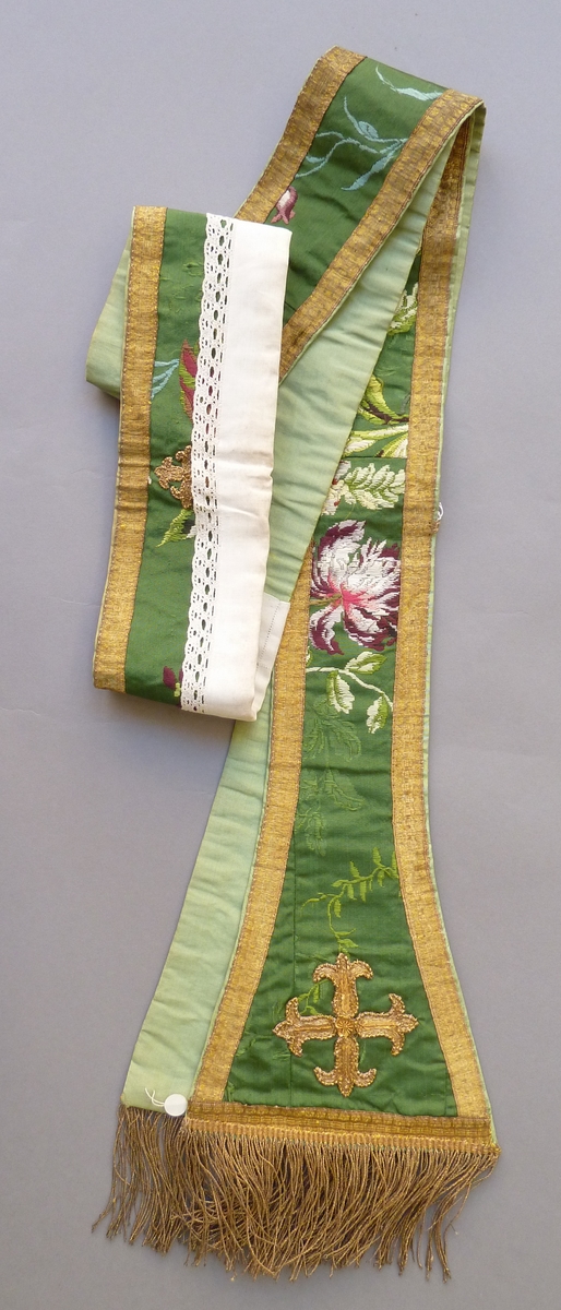 Groene diakenstola met veelkleurig ingeweven bloemmotief, versierd met goudgalon