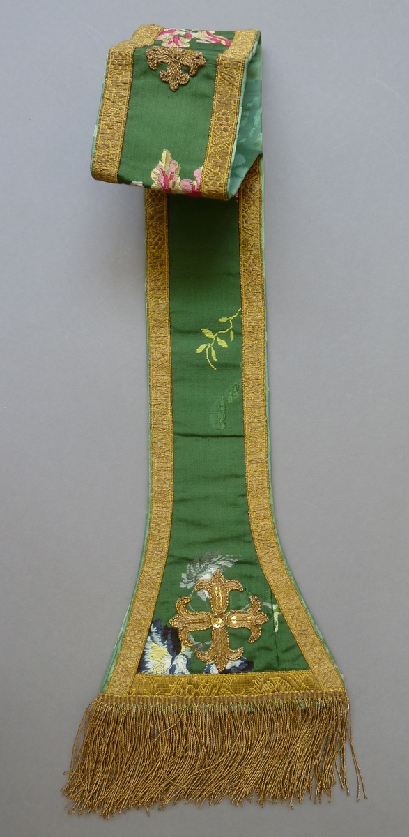 Groene manipel met veelkleurig ingeweven bloemmotief, versierd met goudgalon en goudfranje