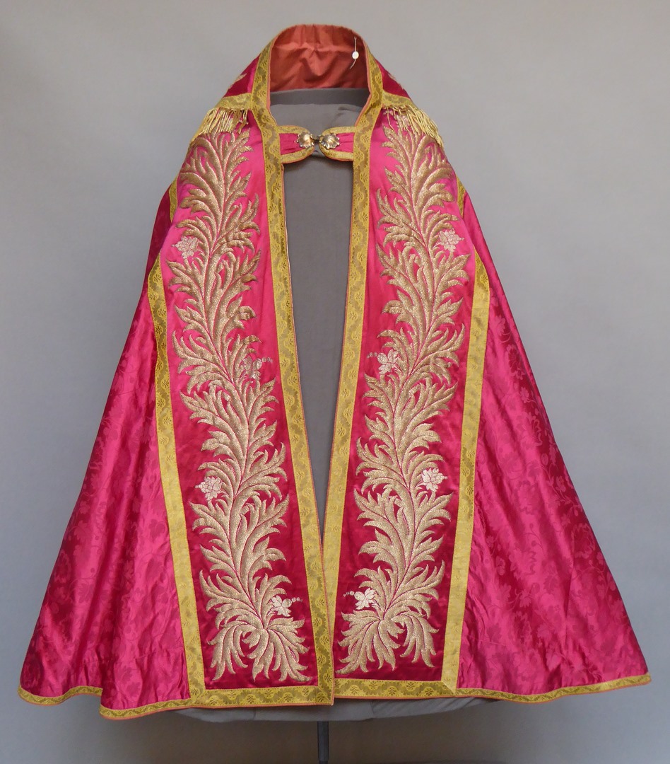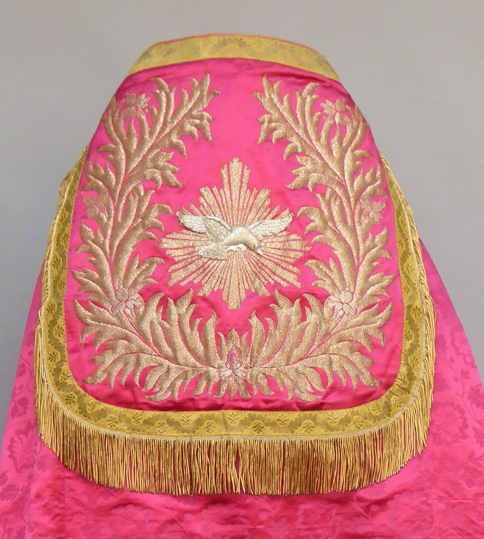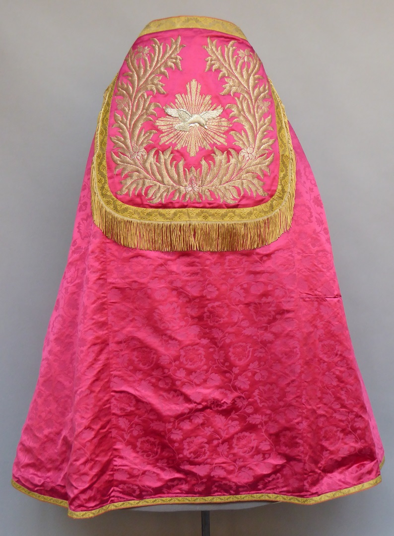 Rode koorkap met ingeweven strooibloemmotief, bladranken van goudbrokaat en zilverkleurige duif