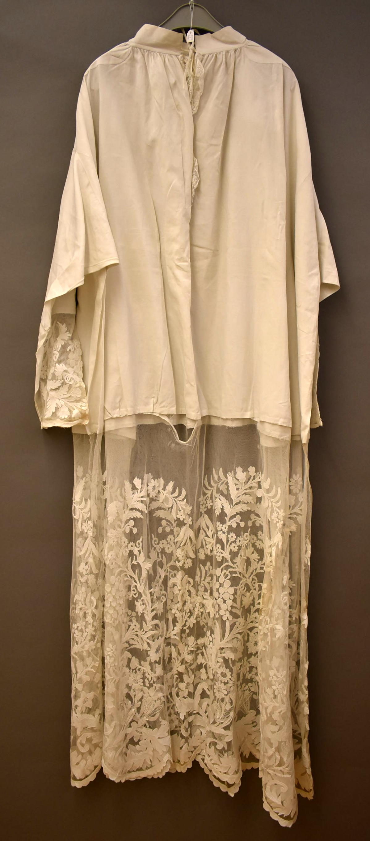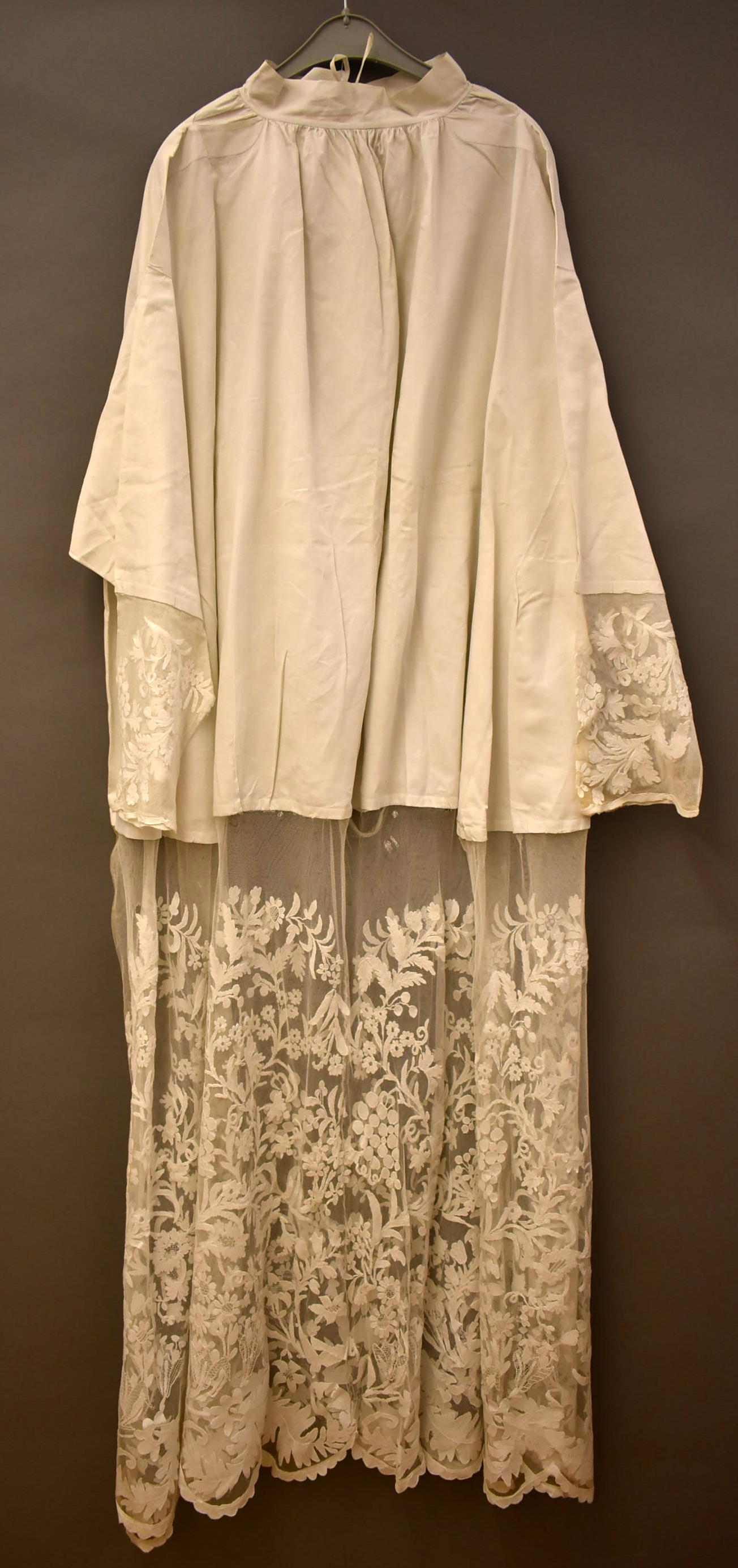 Albe afgezet met application de Bruxelles met bloemen en druivenranken, in hals monogram M.P.