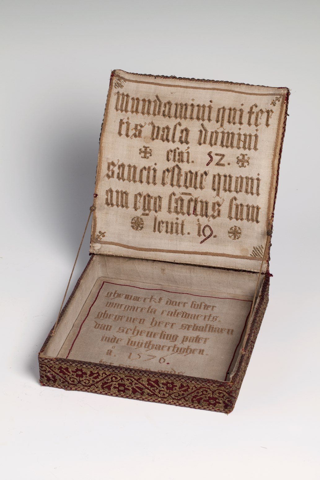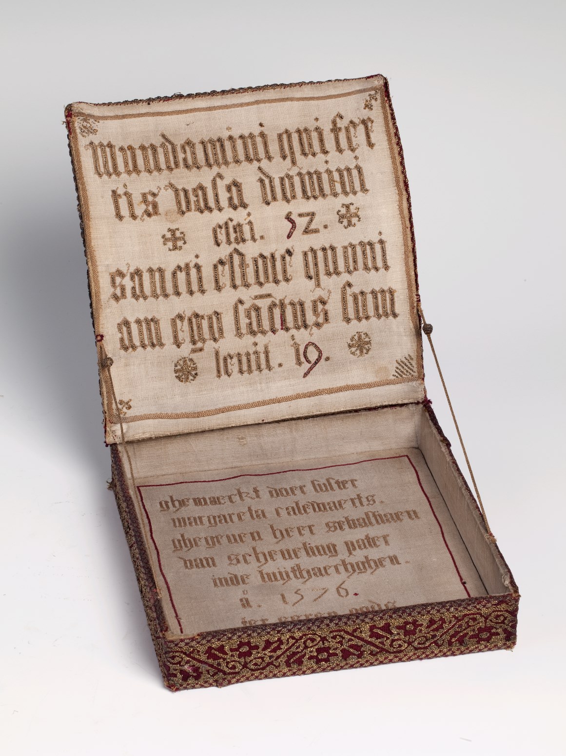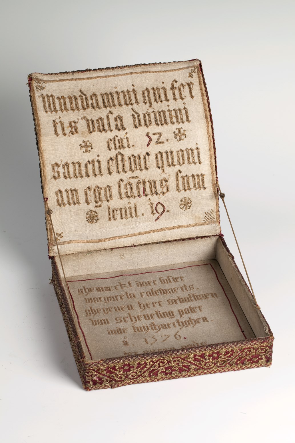 Palladoos overtrokken met linnen, geborduurd met ruiten en bloemen in rood en goud