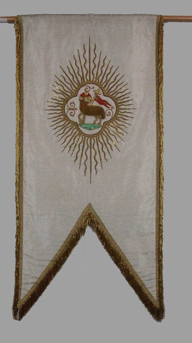 Wit vaandel met gehoogd Lam Gods in stralenkrans