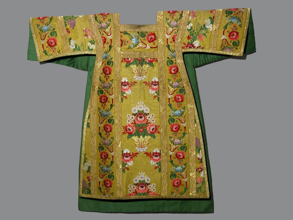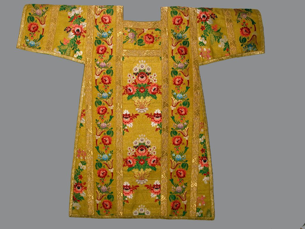 Dalmatiek, goudkleurig, met veelkleurige ranken- en bloemmotief