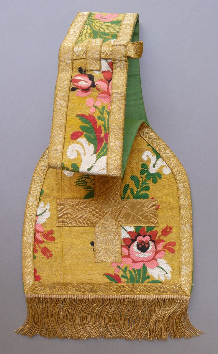 Manipel, goudkleurig, met veelkleurige ranken- en bloemmotief, met goudfranje