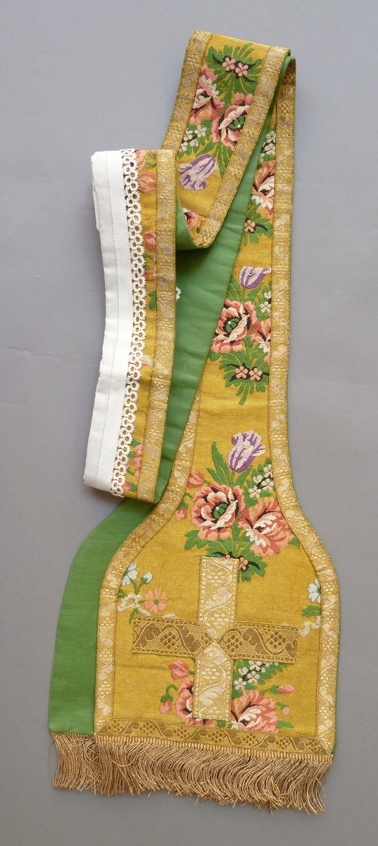 Stola, goudkleurig, met veelkleurige ranken- en bloemmotief