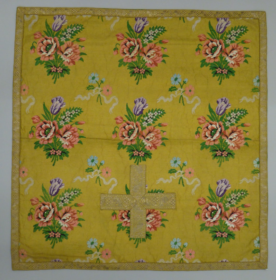 Kelkvelum, goudkleurig, met veelkleurige ranken- en bloemmotief