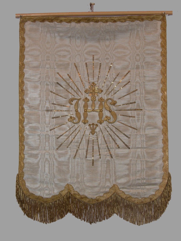 Wit moirézijde processievaan gebrocheerd met zilverdraad, met IHS in stralenkrans in gouddraad