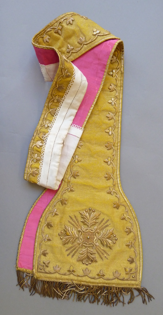 Goudkleurige stola met geborduurde ranken en kruisjes van gehoogd gouddraad