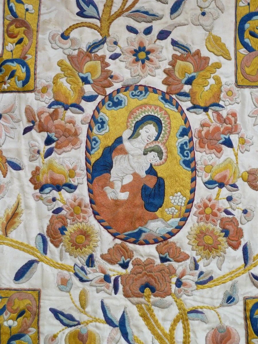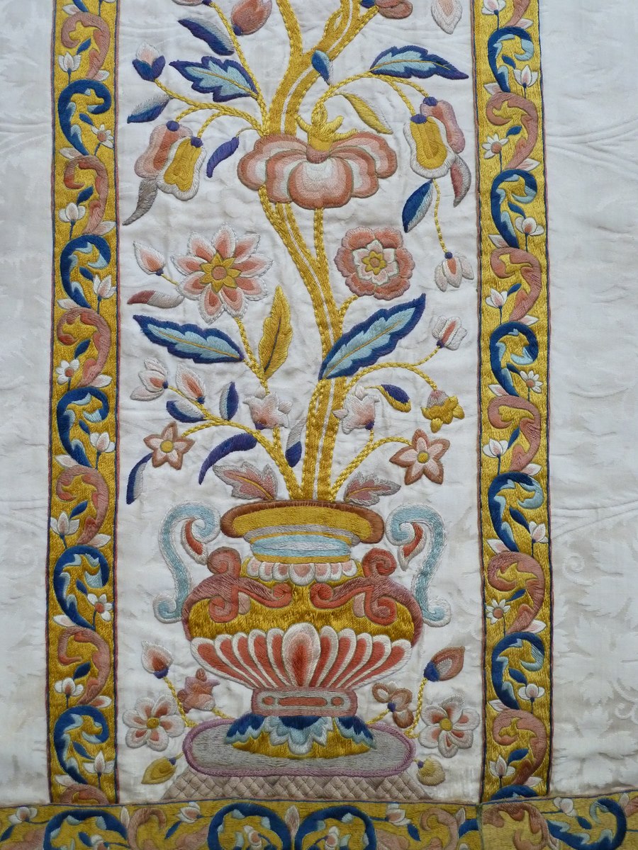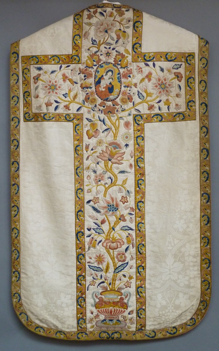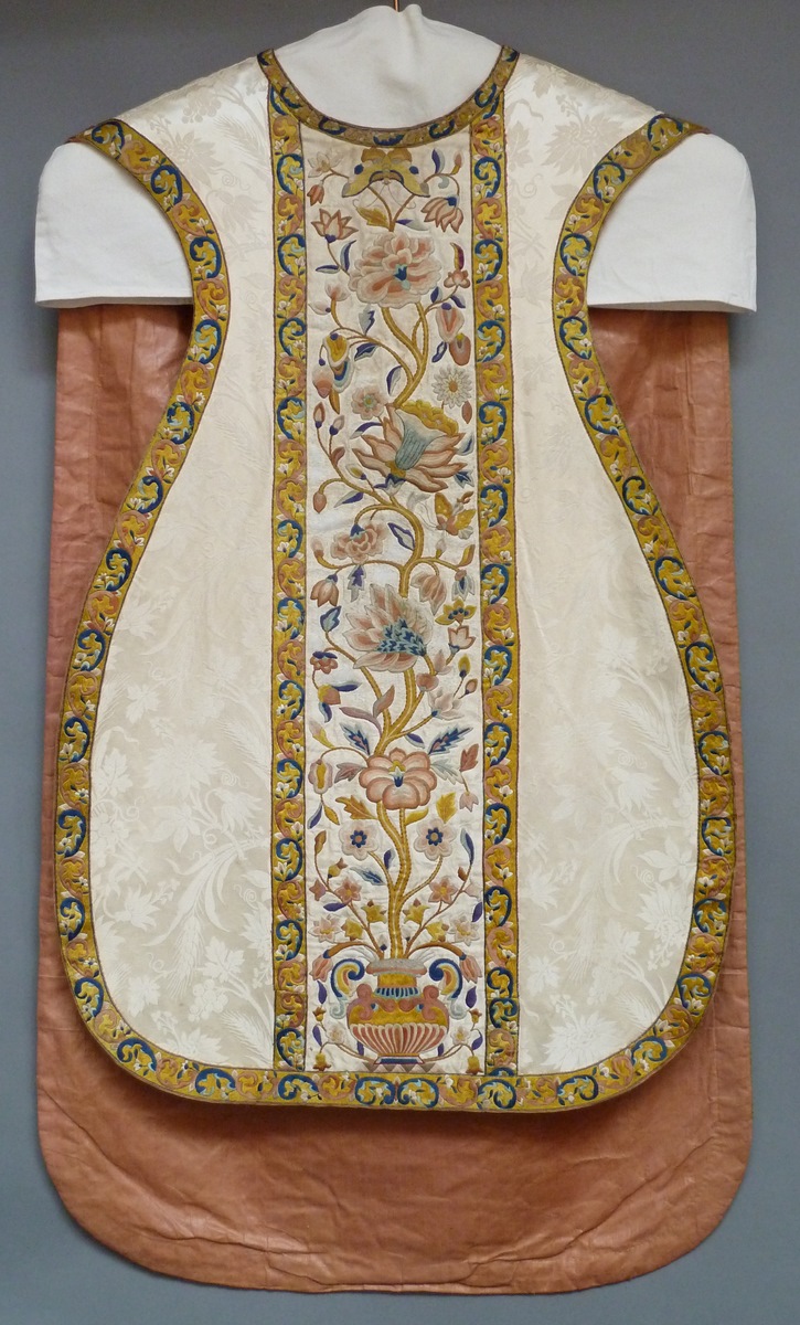 Wit kazuifel met ingeweven wijnranken en druivenmotief, versierd met Chinees borduurwerk