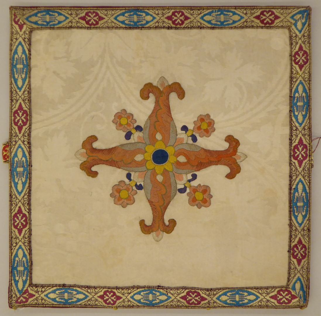 Witte beurs met ingeweven motief van wijnranken en druiven, met geborduurd kruis