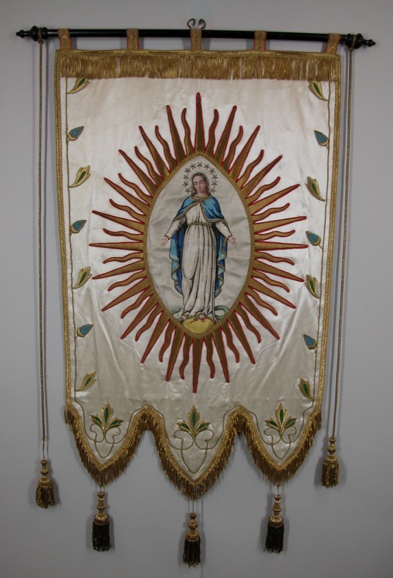 Wit vaandel met Maria die de slang vertrapt in een stralenkrans