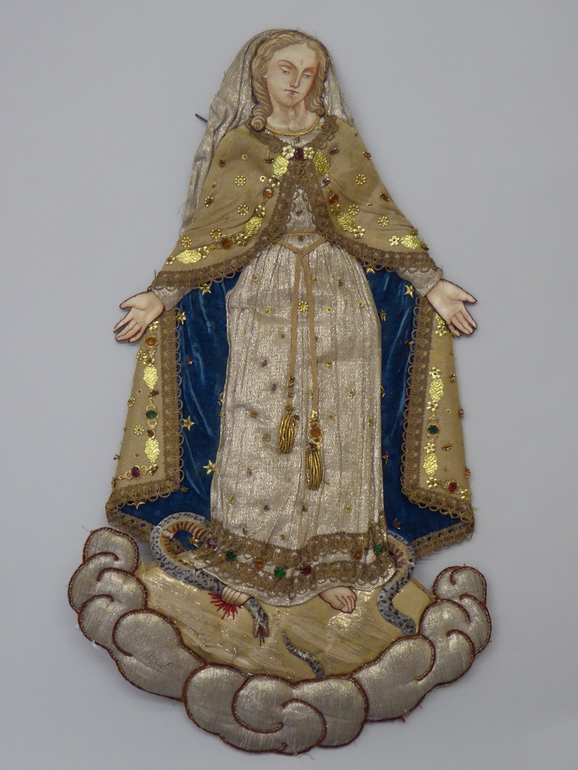 Borduursel van ballustradebekleding: Maria met haar voeten de slang vertrappend