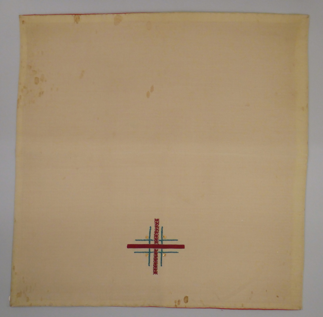 Wit kelkvelum met in koordzijde geborduurde kruisen en geappliceerde stukjes goudleer