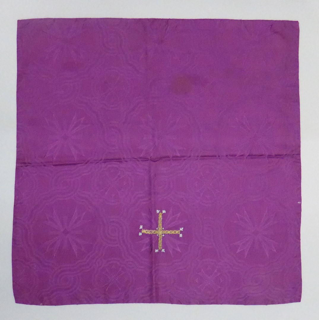 Paars kelkvelum met ster- en kruismotieven en met goudgalon en grijze zijde geborduurde kruisjes