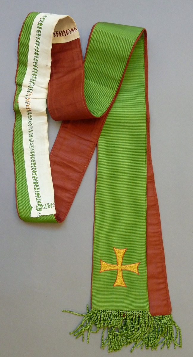 Groene stola met donkerrode rand en goudkleurige kruisje aan uiteinden