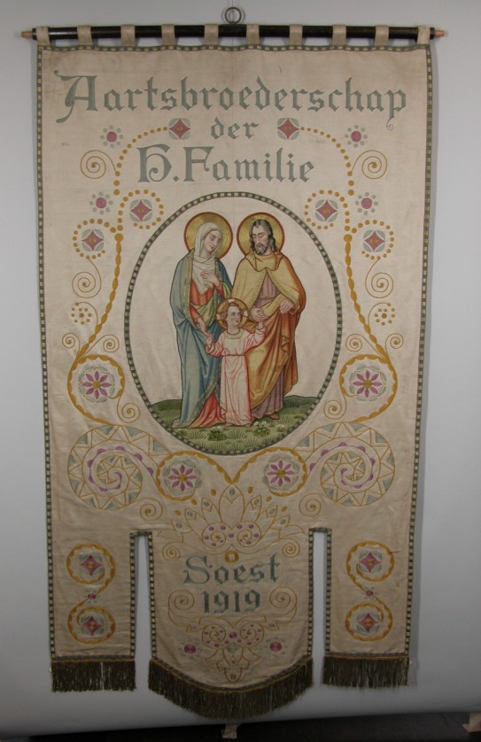 Wit (crème) vaandel met wandelende H. Familie en tekst: Aartsbroederschap der H. Familie Soest 1919