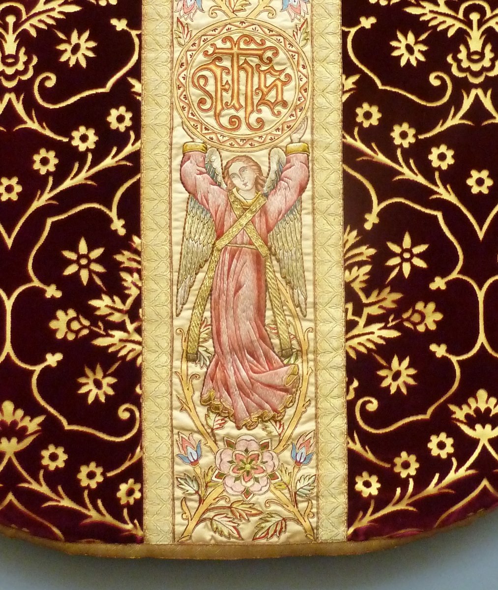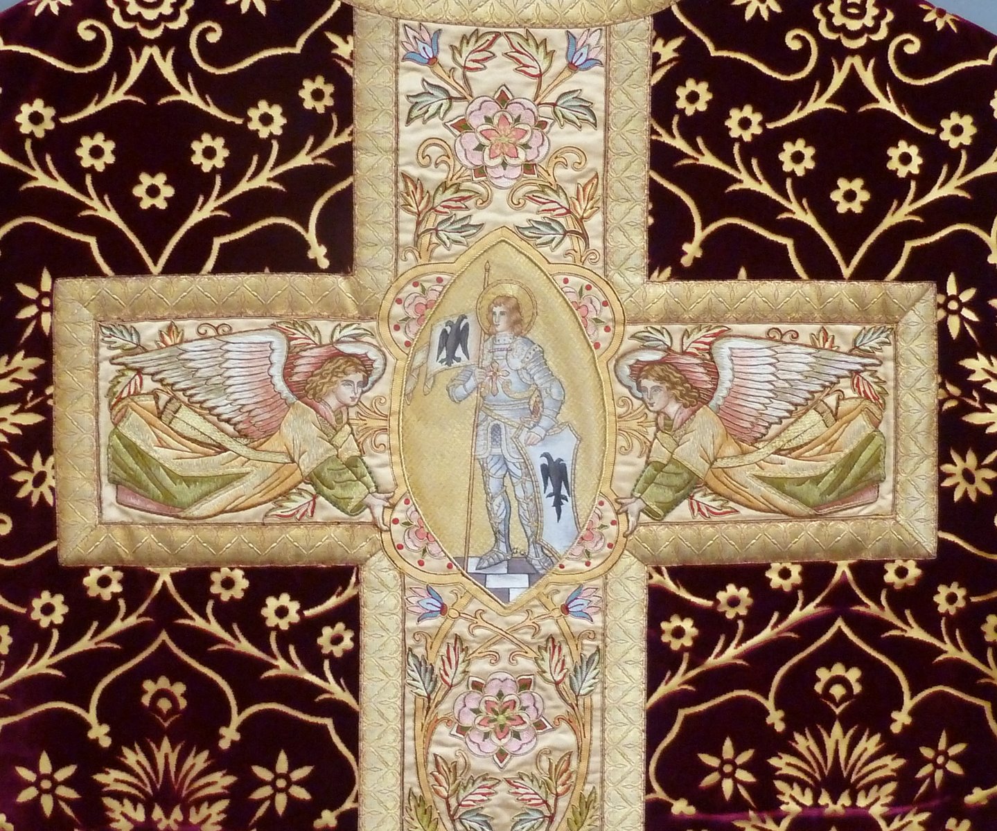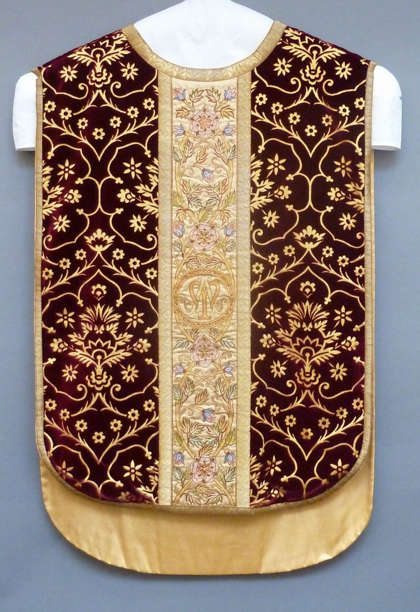 Rood kazuifel van geschoren fluweel met granaatappelmotief en H. Hippolytus