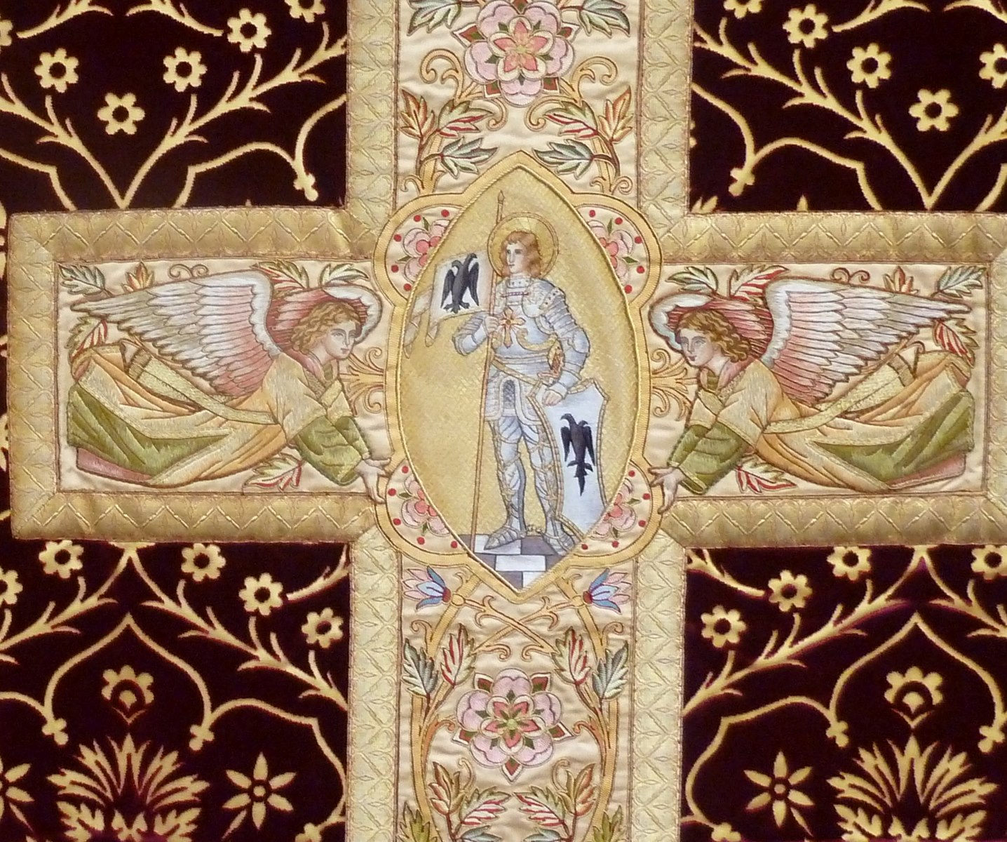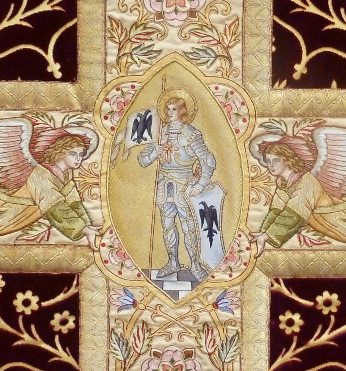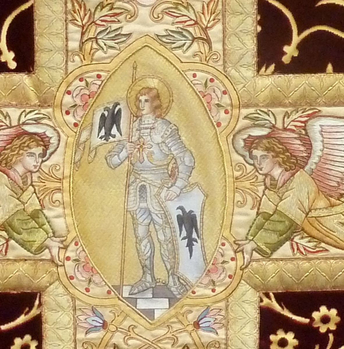 Rood kazuifel van geschoren fluweel met granaatappelmotief en H. Hippolytus