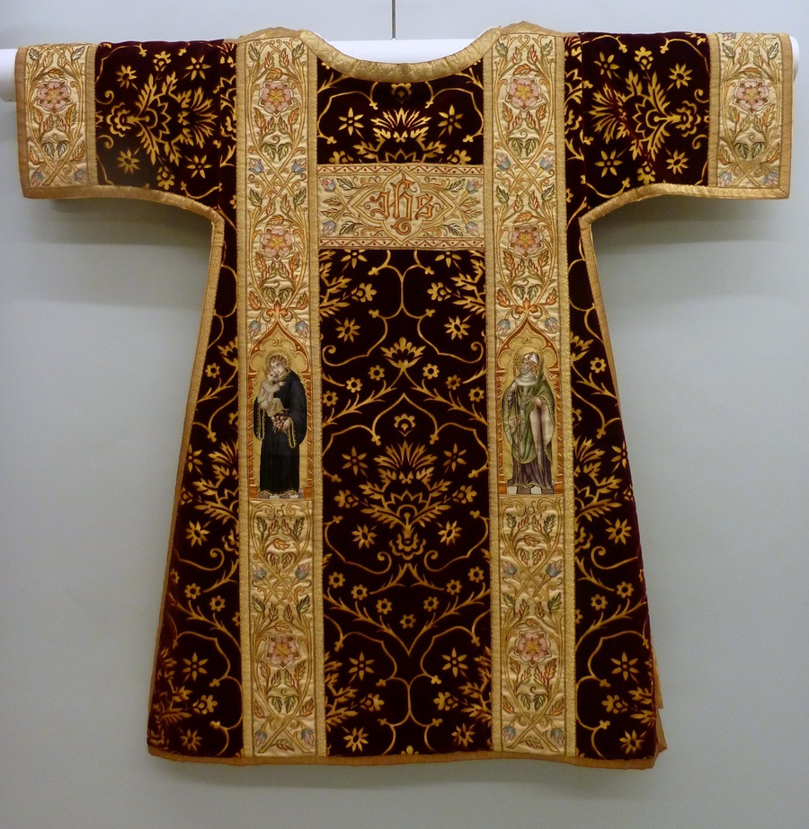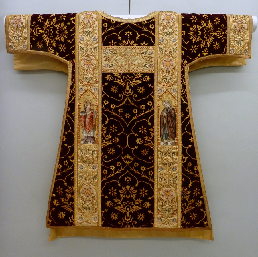 Rode dalmatiek van geschoren fluweel met granaatappelmotief, stichtersbisschop en heiligen