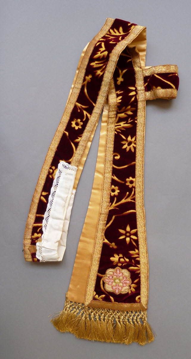 Rode diakenstola met gele achtergrond en granaatappelpatroon