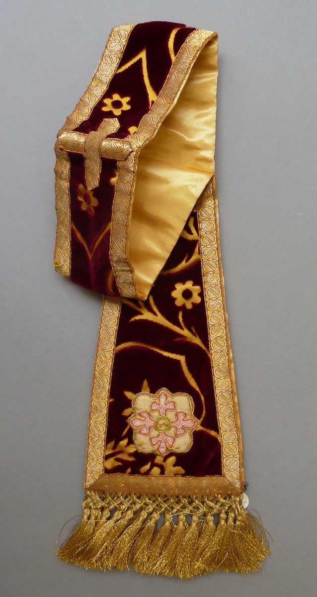 Rode manipel met gele achtergrond en granaatappelpatroon, met goudfranje