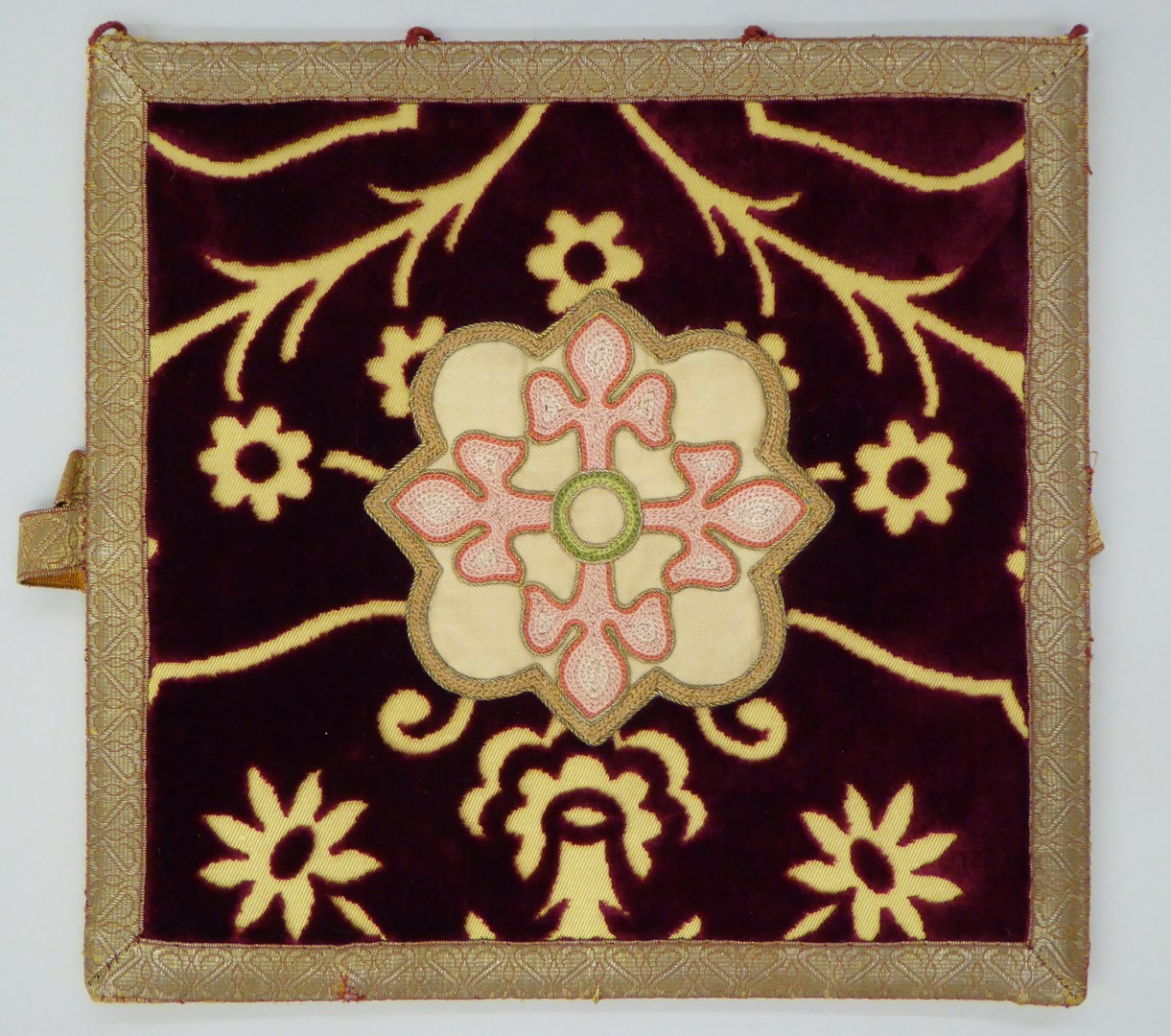 Rode beurs met gele achtergrond en granaatappelpatroon