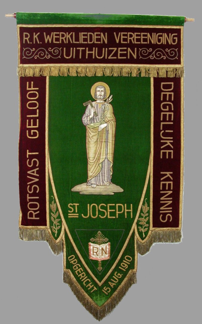 Groen vaandel met H. Jozef met lelietak en winkelhaak, met rode banen met o.a. "r.k. werklieden vereeniging Uithuizen"