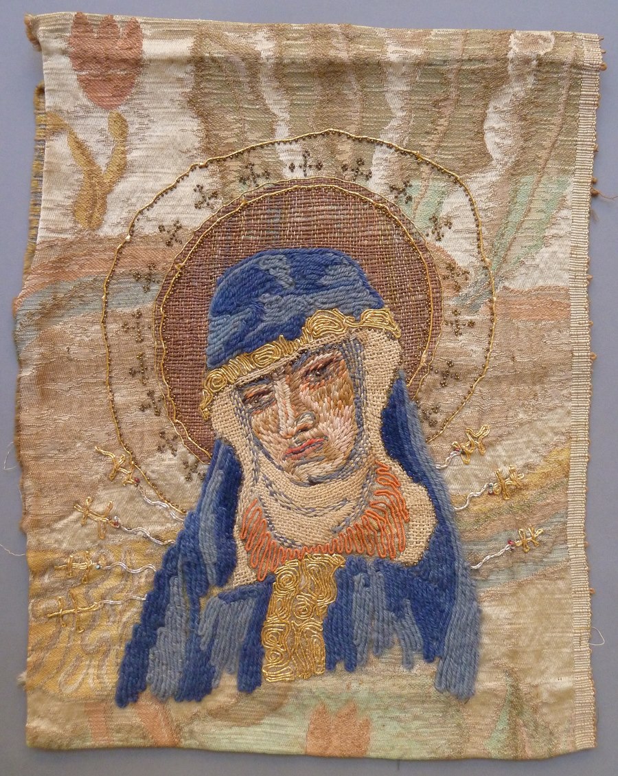Wandkleed met borstbeeld Maria geborduurd met zijde, wol en kraaltjes