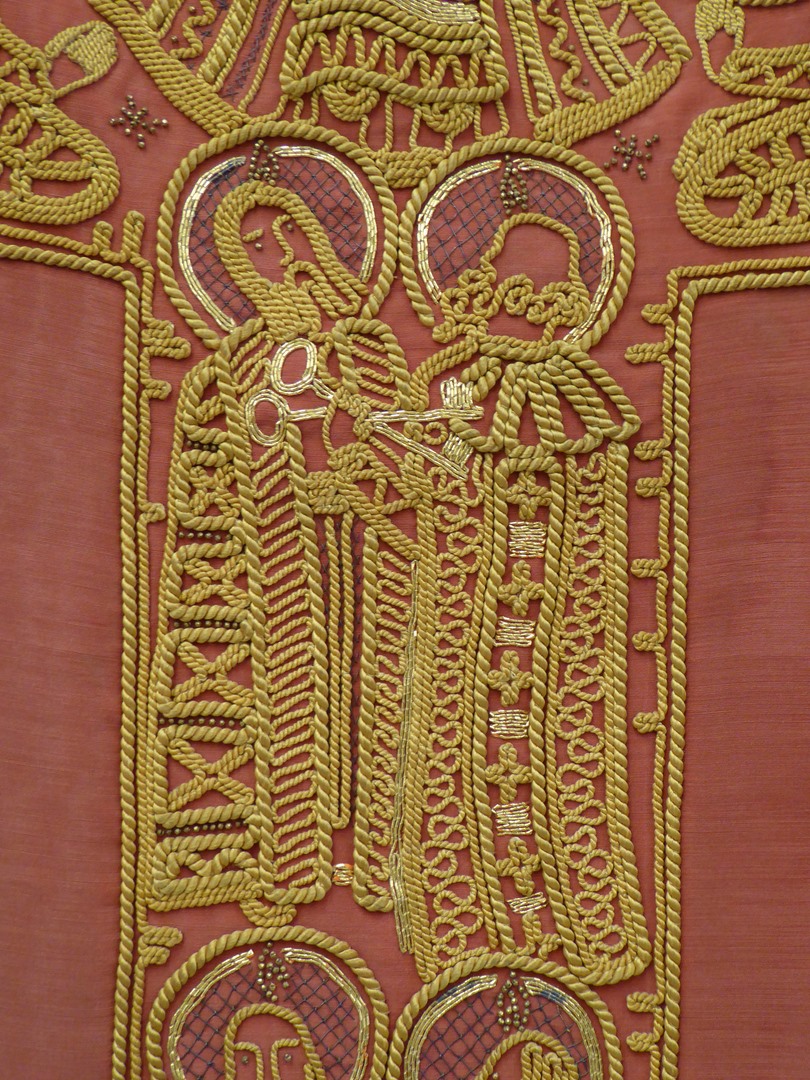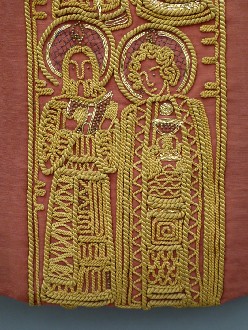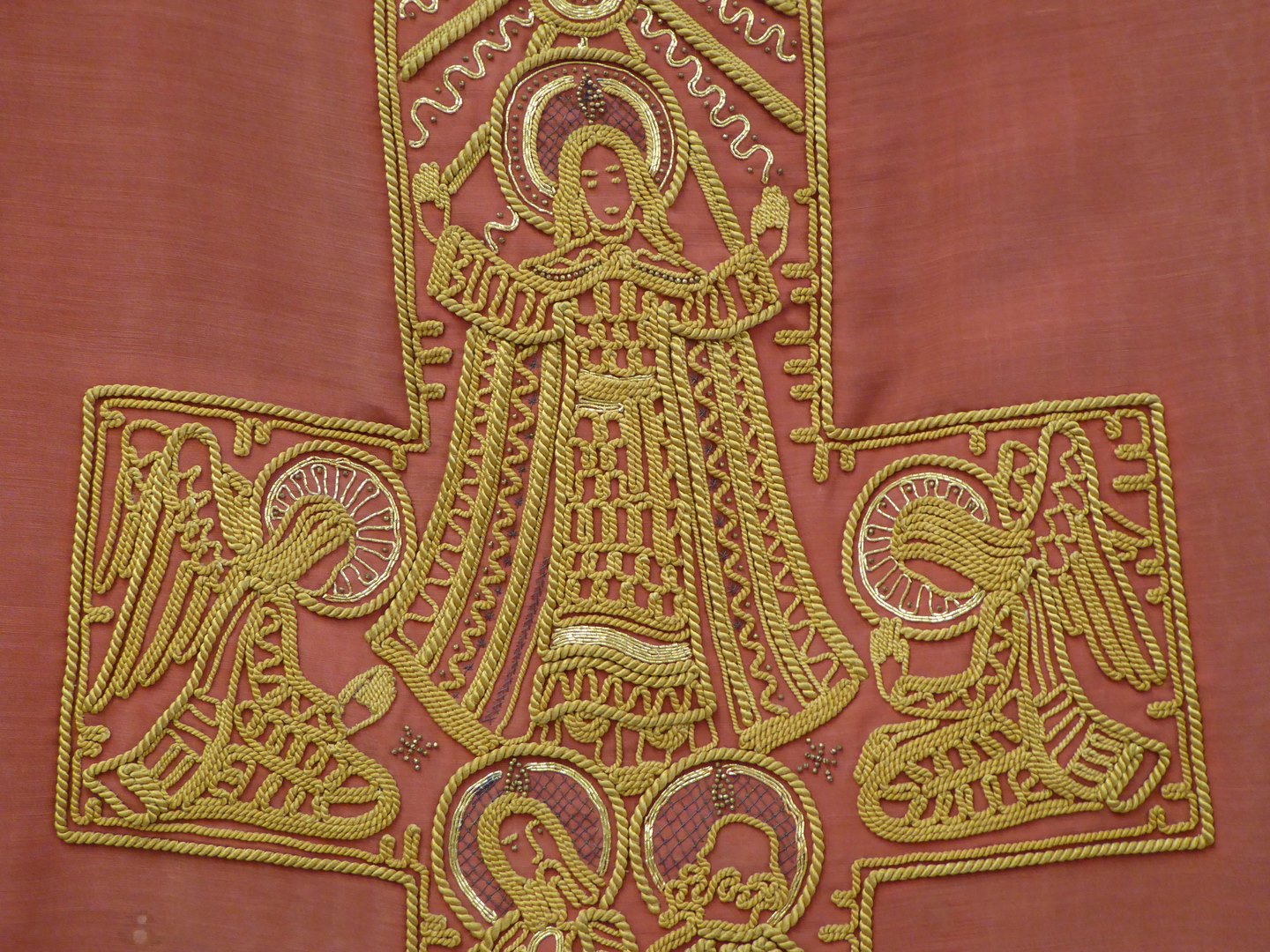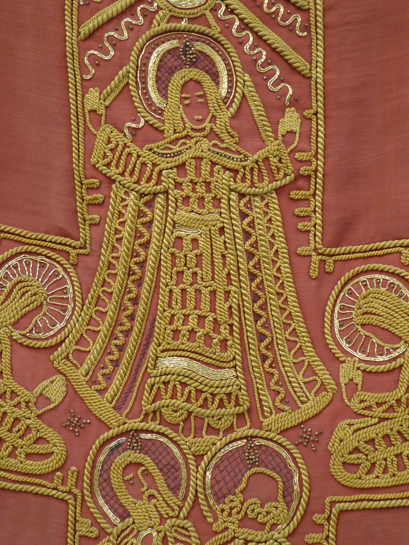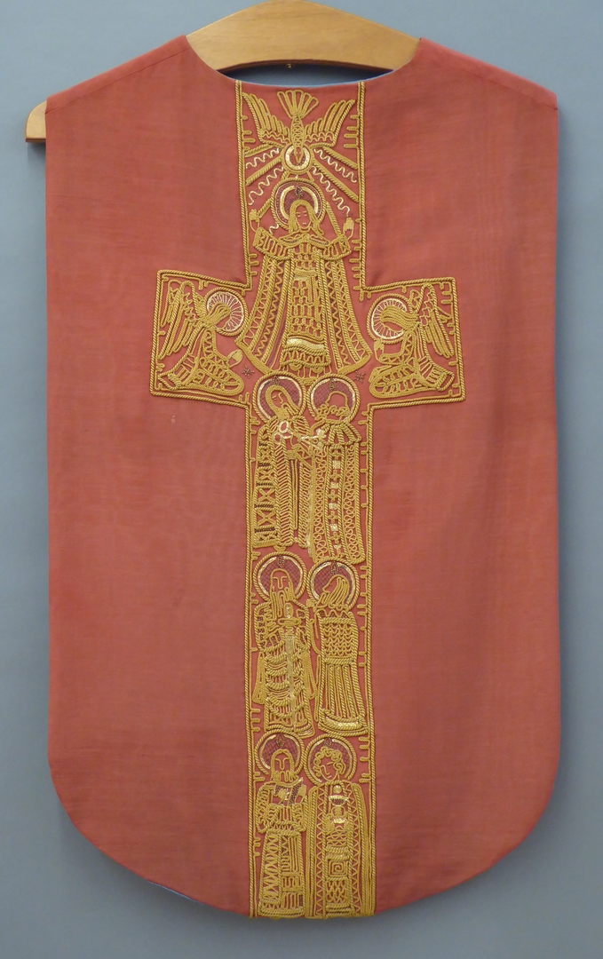 Rood kazuifel met geel koordwerk, 12 apostelen, Maria Hemelvaart, twee engelen en H. Geest
