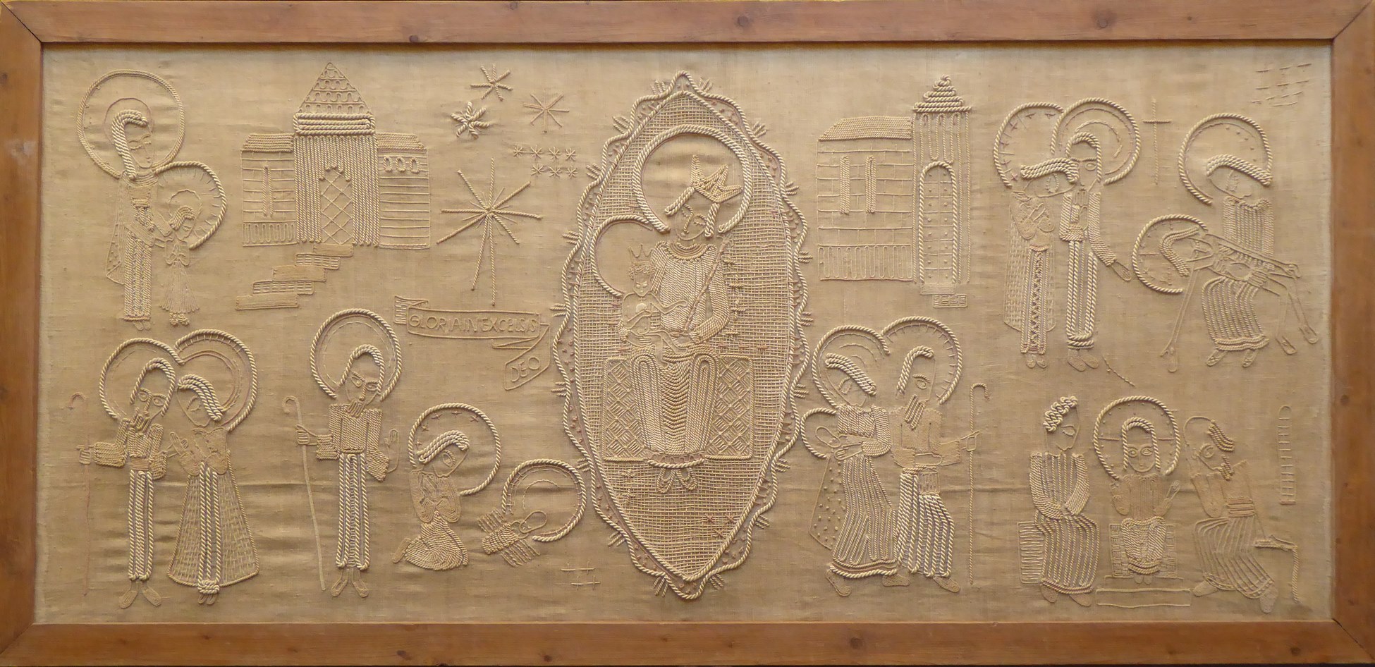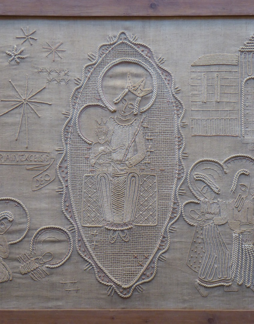 Naturelkleurig antependium met in koordborduurwerk voorstellingen uit het leven van Christus, met centraal Maria met kind in amandelvorm, met "Gloria in excelsis Deo"