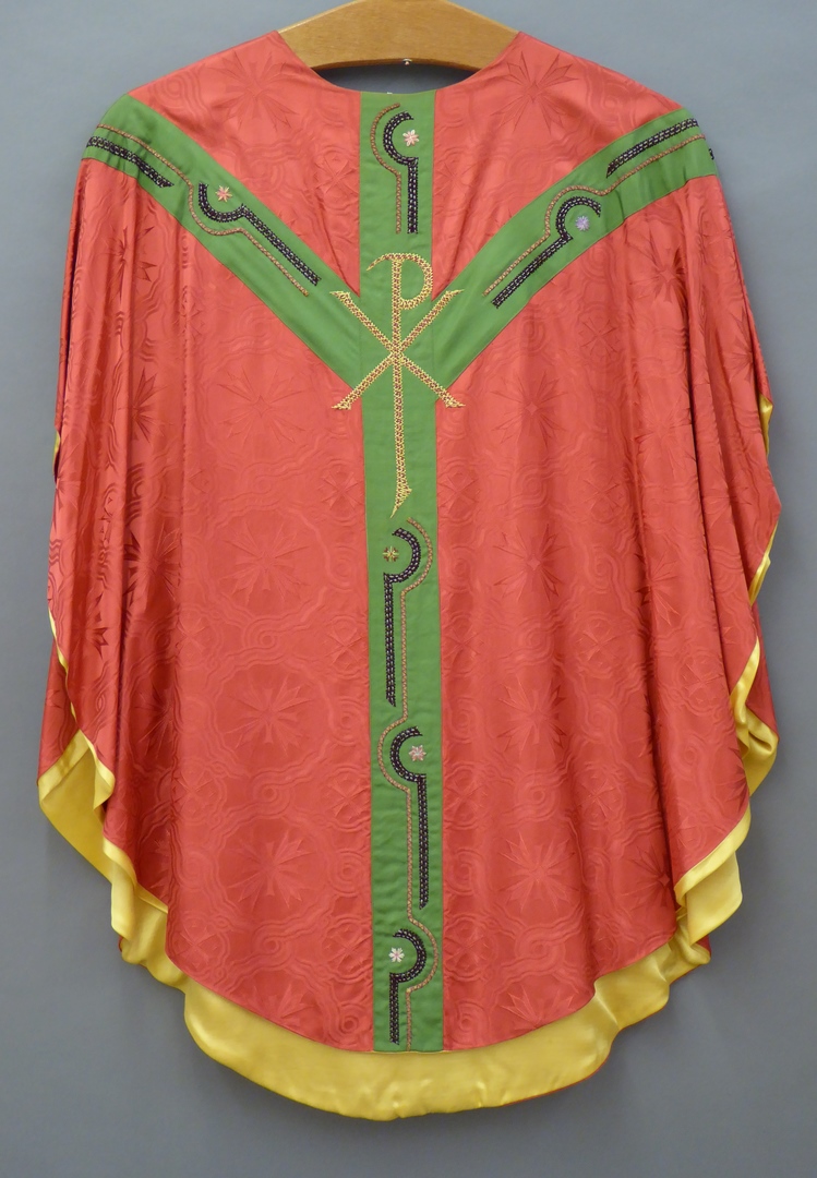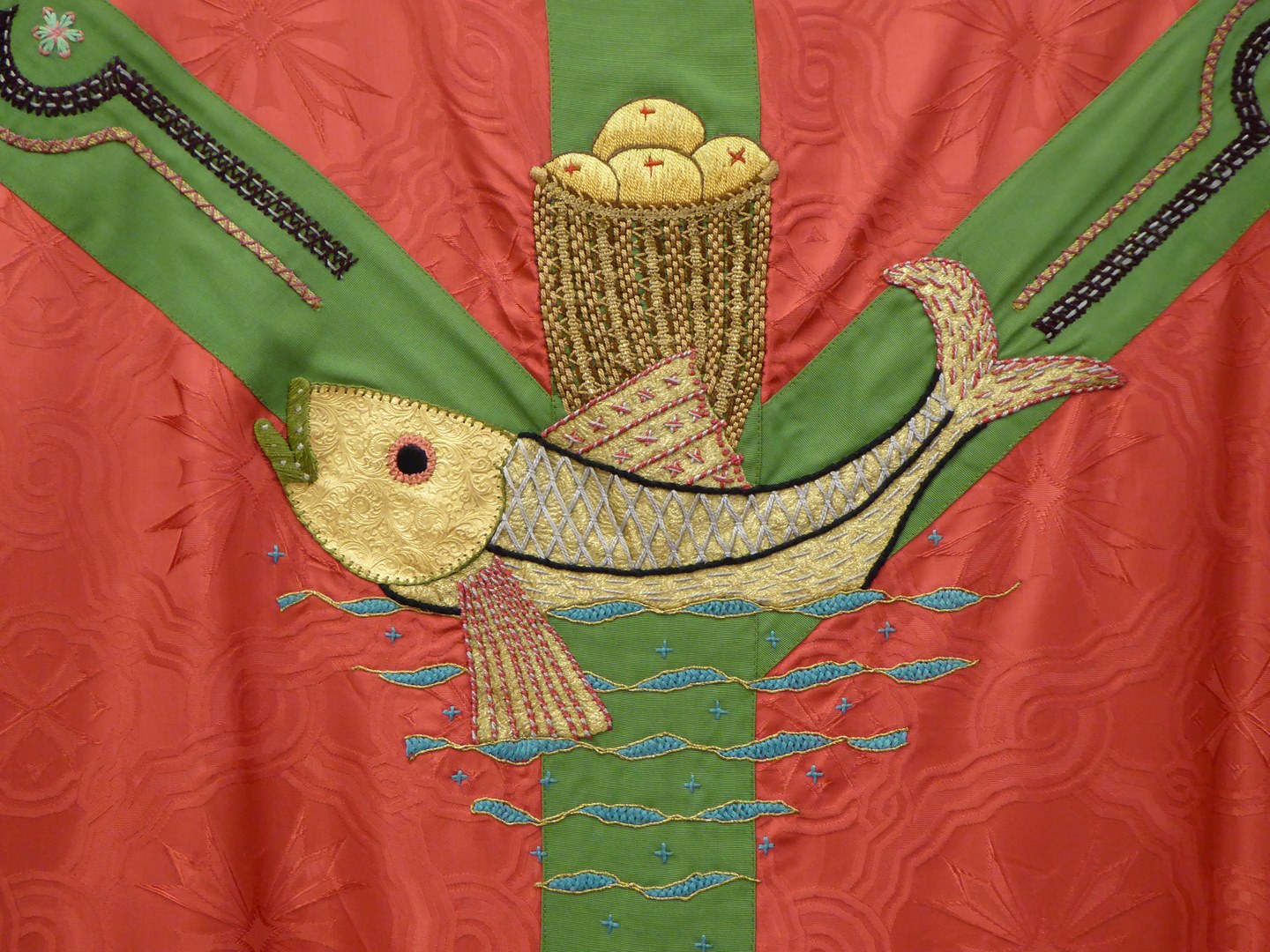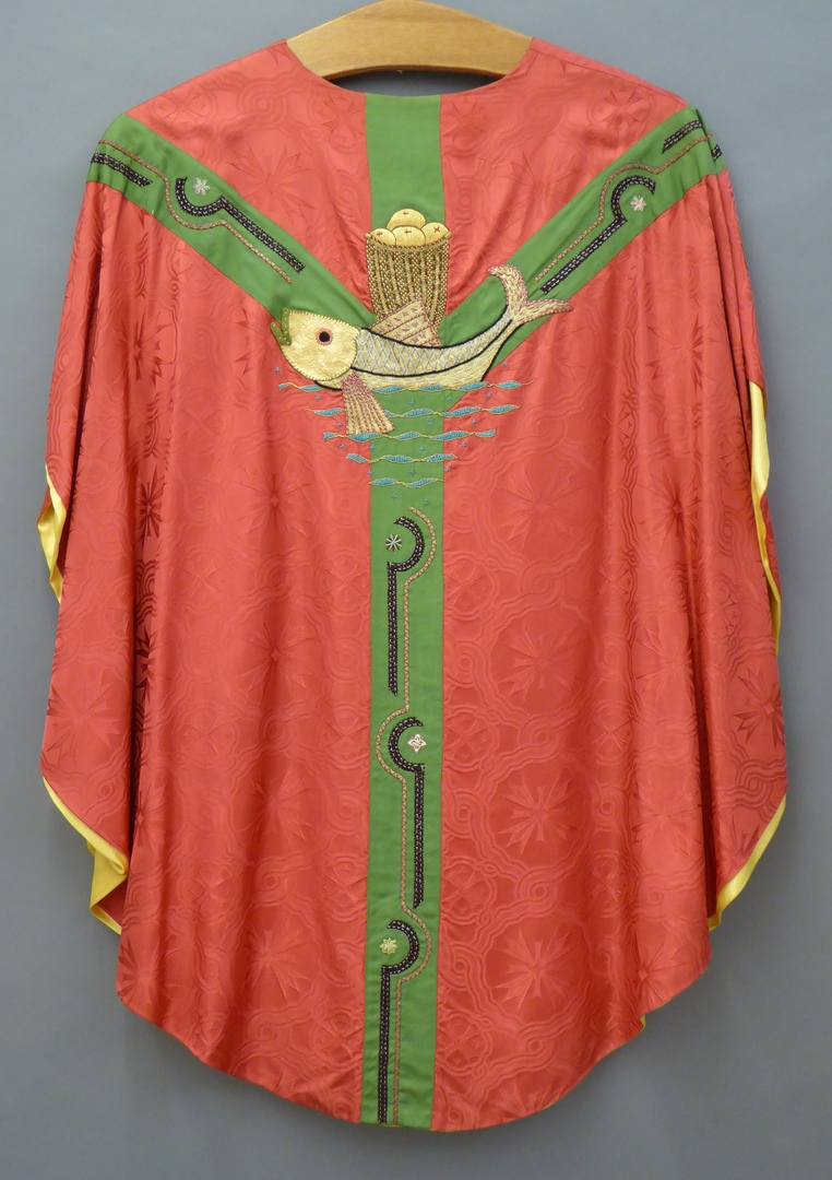 Rood kazuifel met olijfgroen gaffelkruis, vis, broodmand
